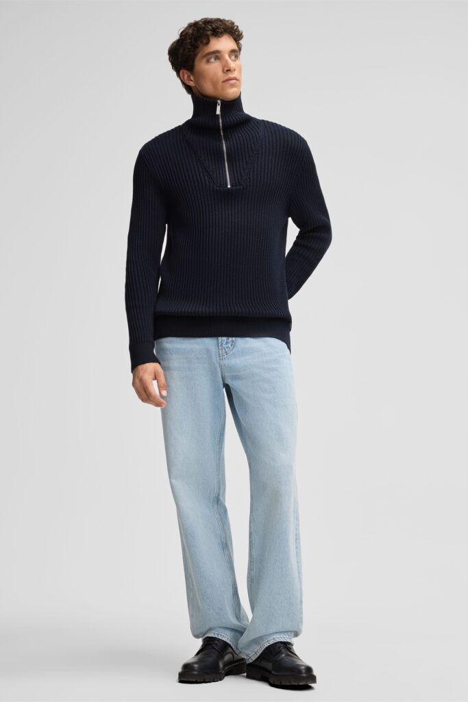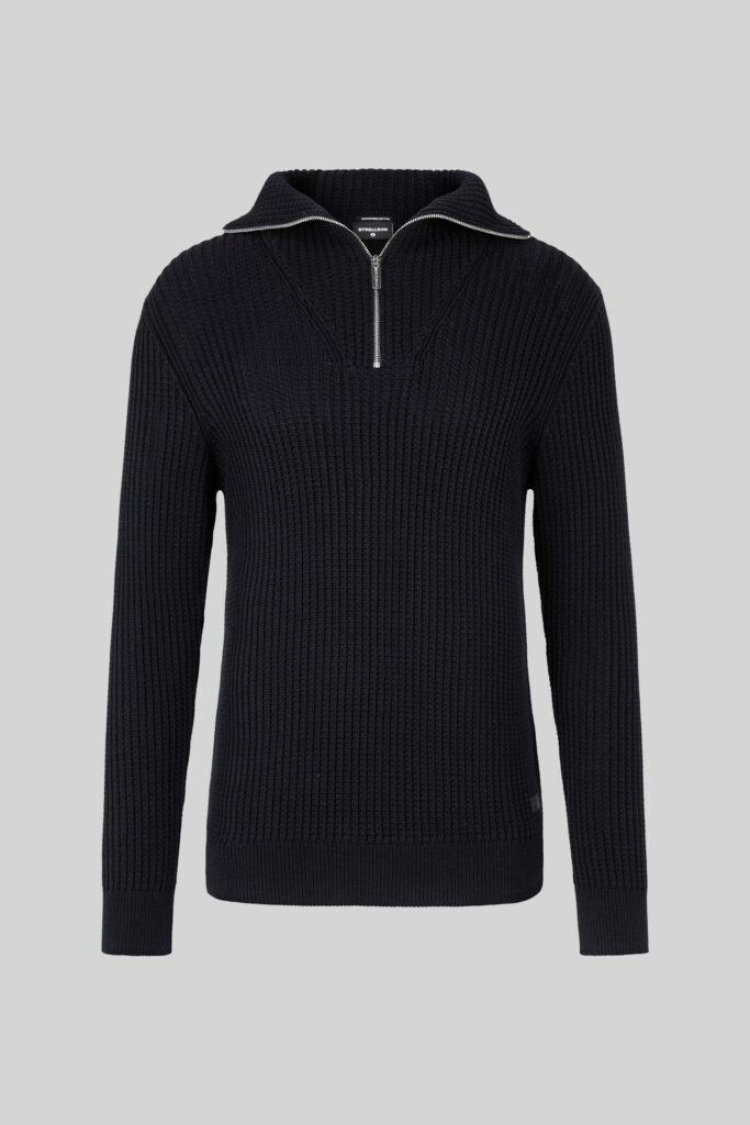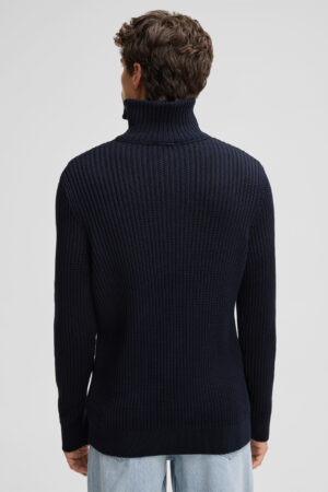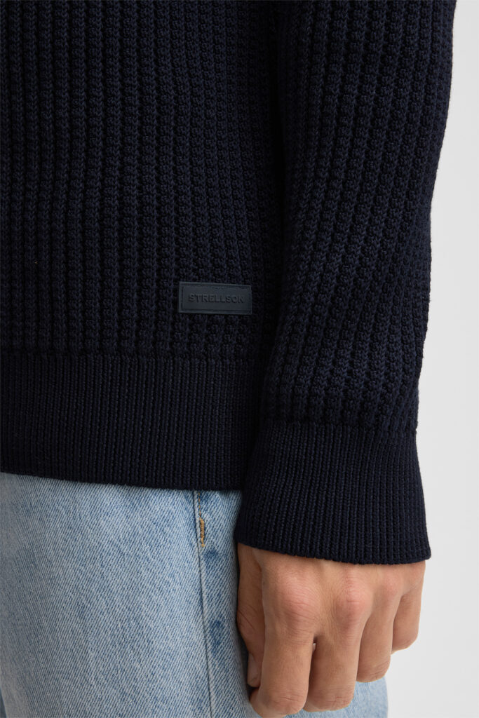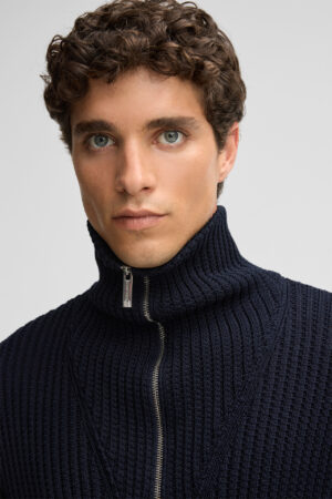 Šveices modes zīmola Strellson tumši zils dekoratīva adījuma vīriešu džemperis ar augstu apkakli un rāvējslēdzēja aizdari. Izgatavots no 100% organiskās kokvilnas. Papildināts ar rievotu apdari un zīmola logotipa detaļām.