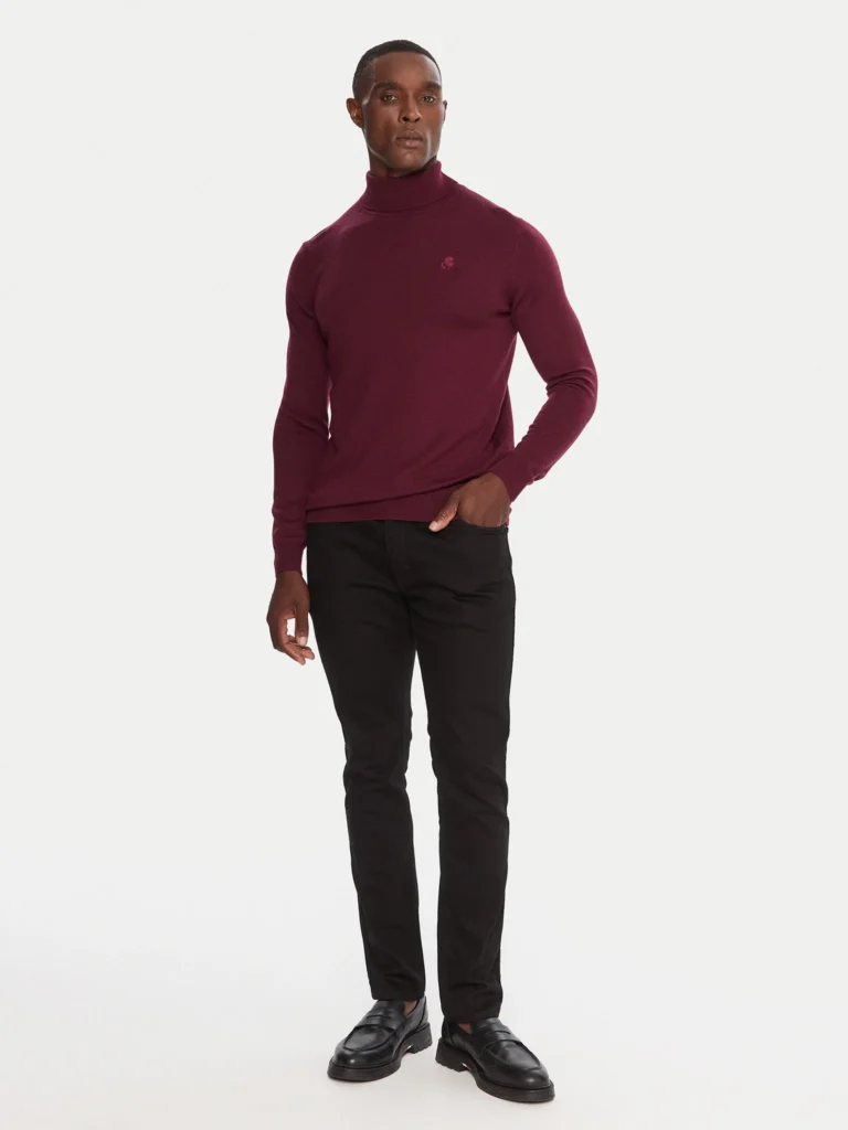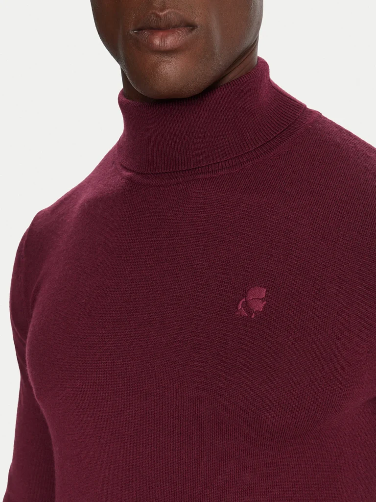 Vācu luksusa zīmola Karl Lagerfeld smalka adījuma vīriešu džemperis ar augstu atlokāmo apkakli bordo krāsā. Izgatavots no mīkstas vilnas dzijas. Papildināts ar smalki rievotu apdari un kamejas stila Karl logo izšuvumu.