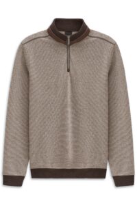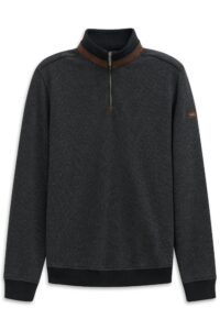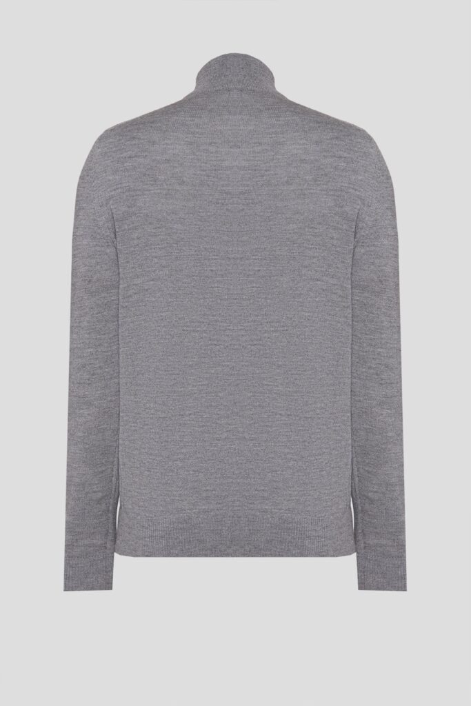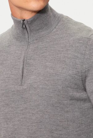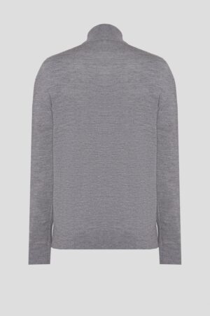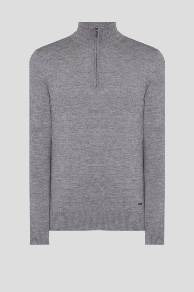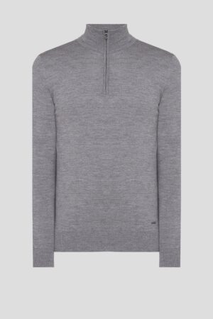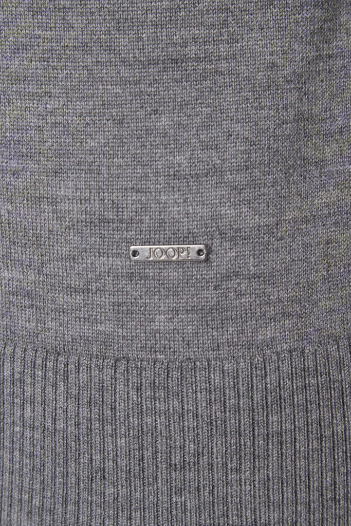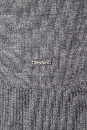 Vācu modes zīmola Joop! pelēks vīriešu džemperis ar augstu apkakli un rāvējslēdzēja aizdari. Izgatavots no mīkstas vilnas dzijas. Papildināts ar smalki rievotu apdarī, kā arī sudraba krāsas metāla un zīmola logotipa detaļām.