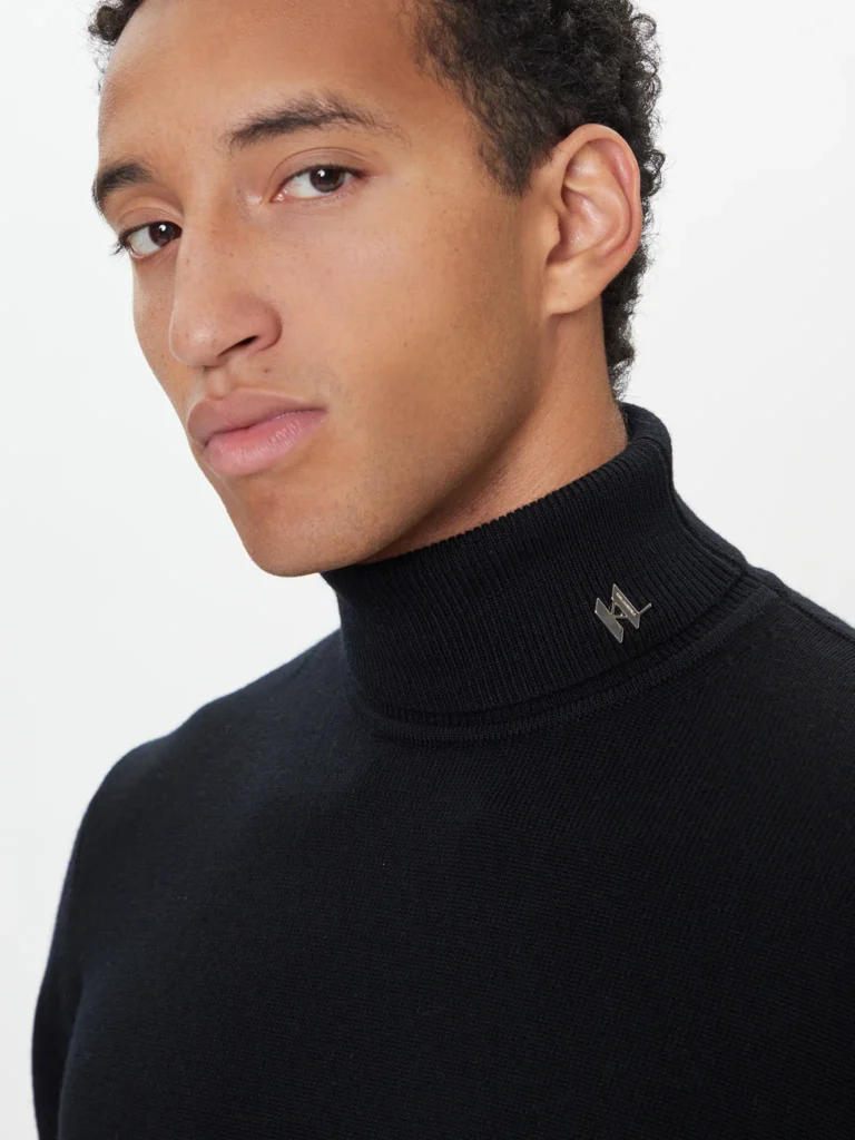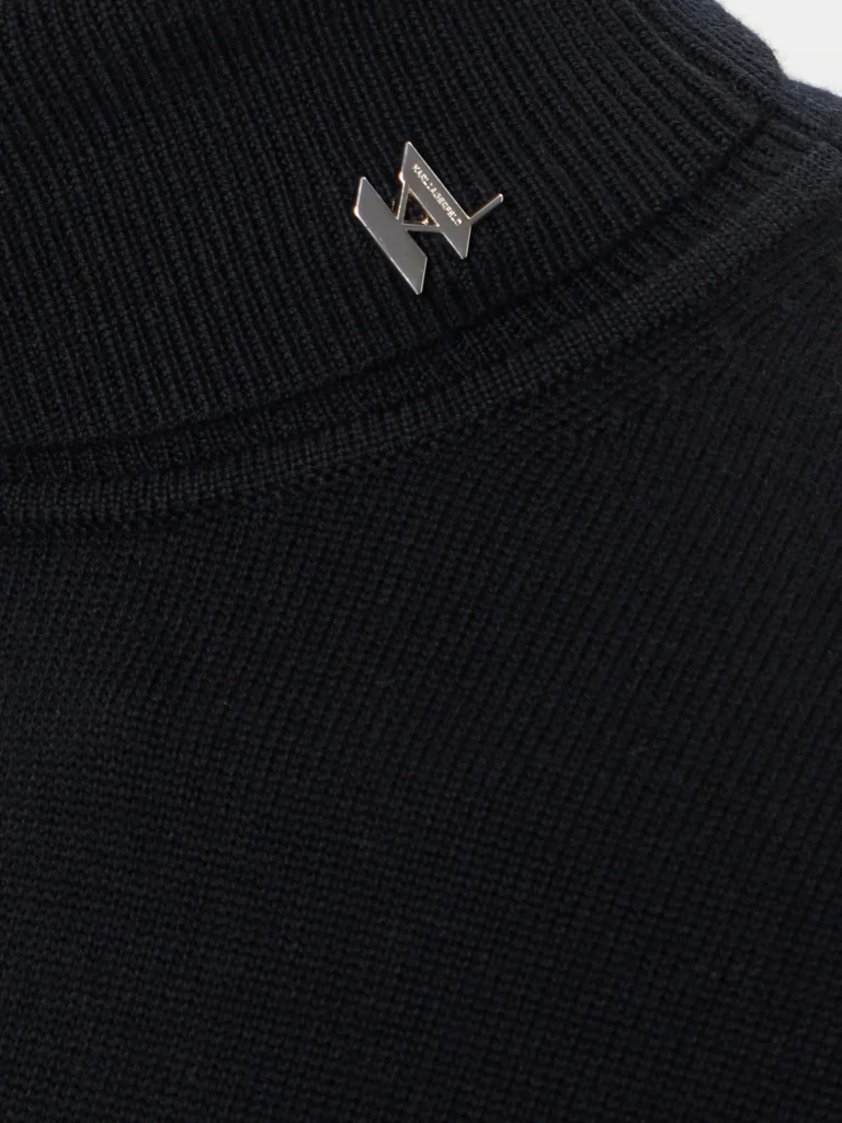 Vācu luksusa zīmola Karl Lagerfeld melns vīriešu džemperis ar augstu atlokāmo apkakli. Izgatavots no mīkstas augstākās kvalitātes vilnas dzijas. Papildināts ar smalki rievotu apdari un sudraba krāsas metāla monogrammas piespaudi.