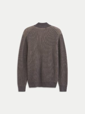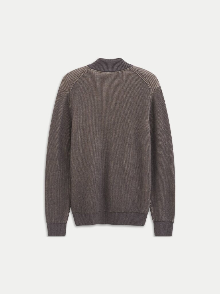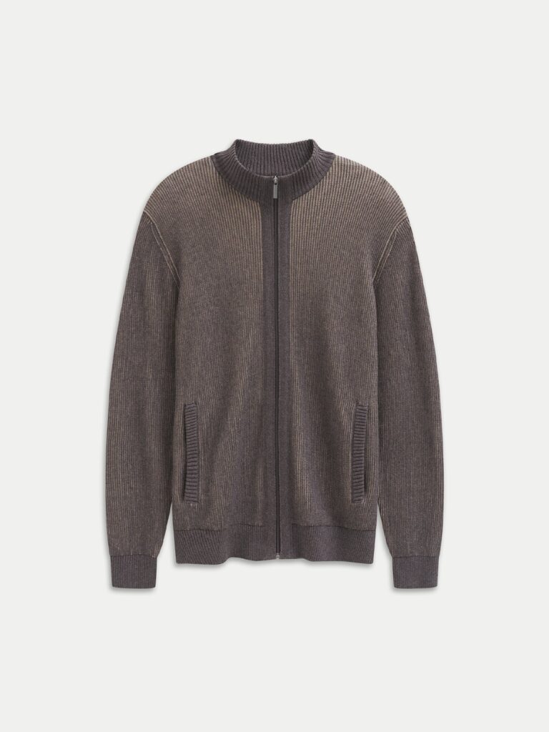 Vācu modes zīmola Bugatti pelēcīgi brūna rievota adījuma vīriešu jaka ar paaugstinātu apkakli un rāvējslēdzēja aizdari. Izgatavota no mīkstas kokvilnas un kašmira dzijas. Papildināta ar sānu kabatām un zīmola logotipa akcentiem.