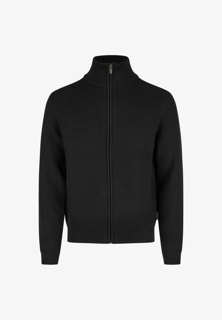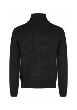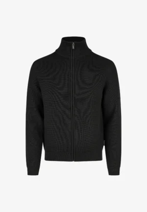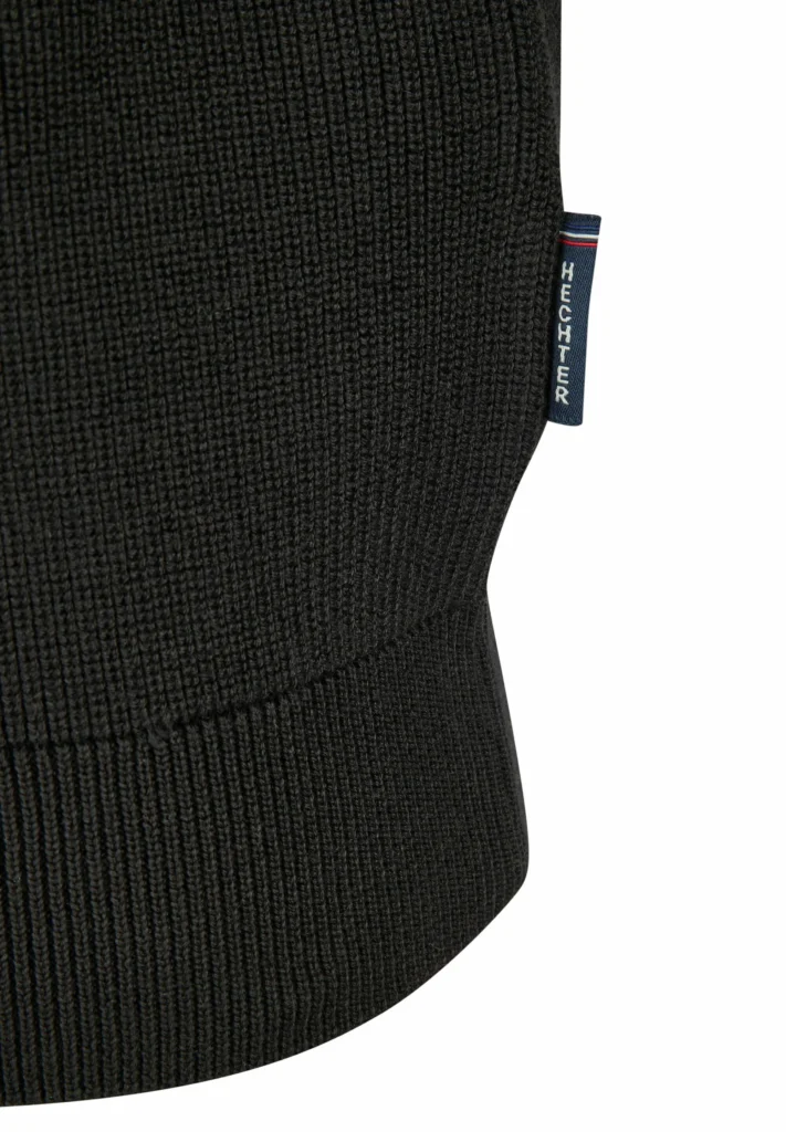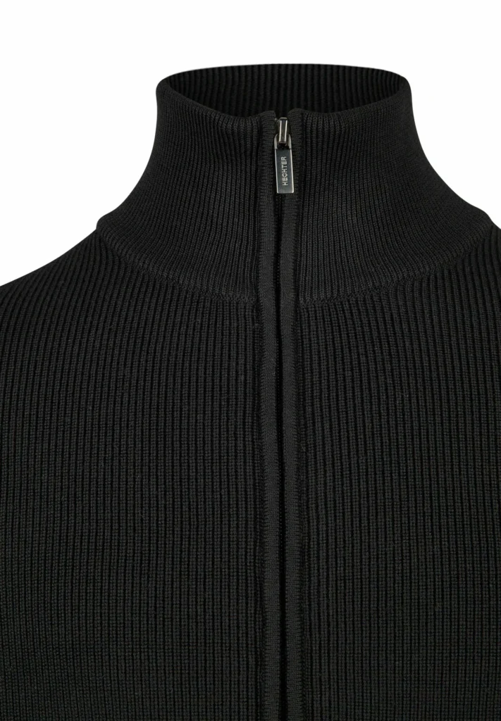 Franču zīmola HECHTER PARIS melna vīriešu jaka ar rāvējslēdzēja aizdari. Izgatavota no modāla un kokvilnas maisījuma materiāla rievota adījuma rakstā. Papildināta ar augstu apkakli un zīmola logotipa detaļām.