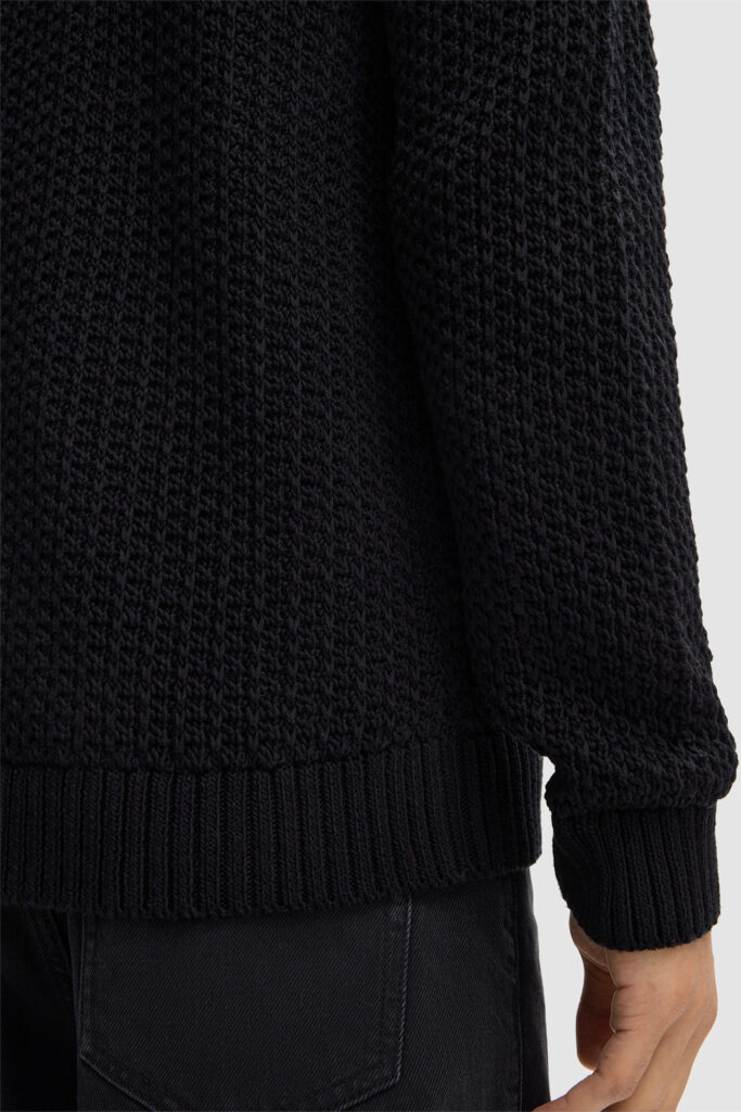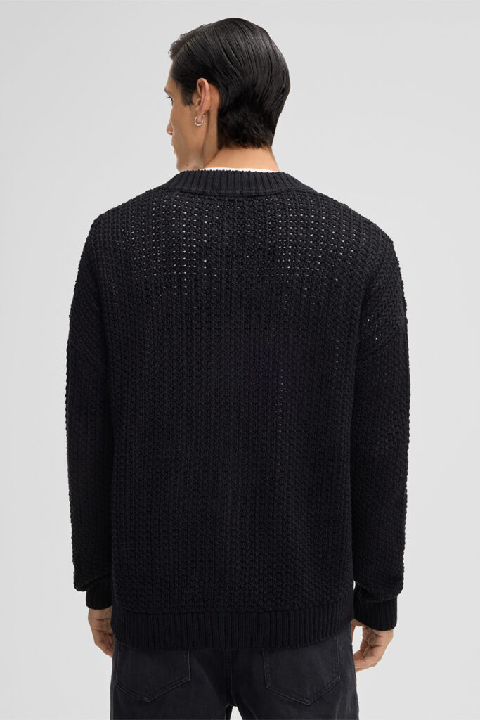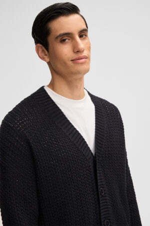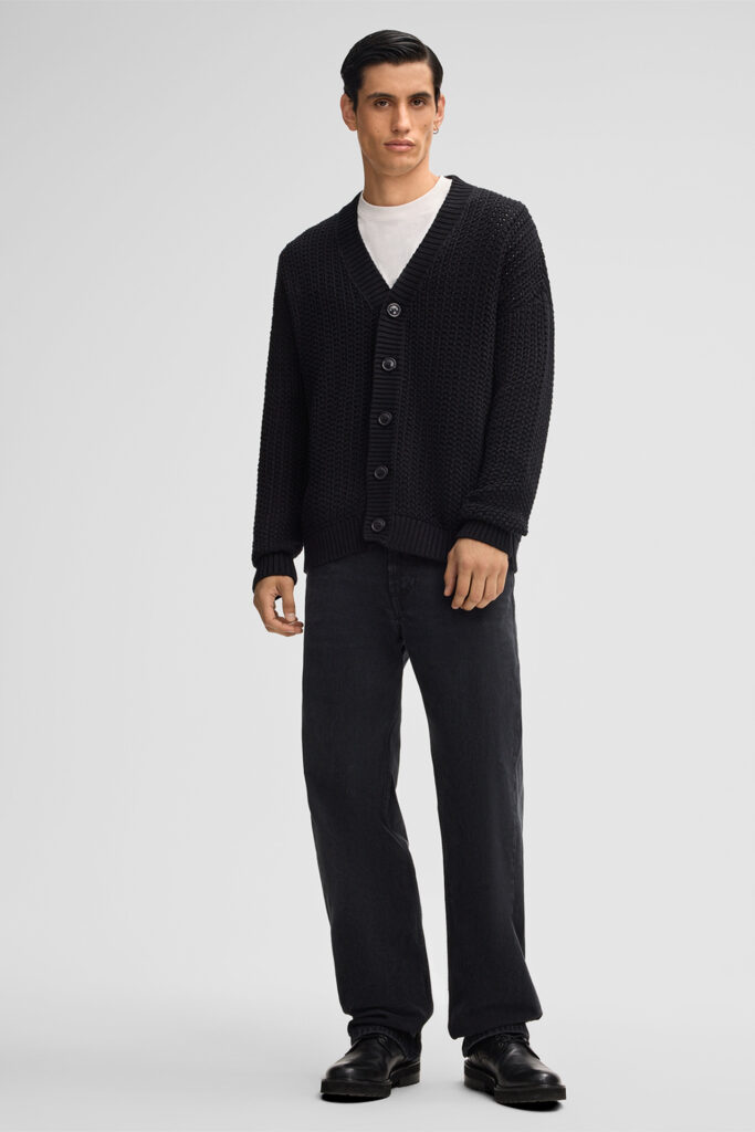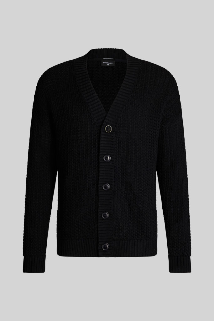 Šveices modes zīmola Strellson melna dekoratīva adījuma vīriešu jaka ar V veida kakla izgriezumu. Izgatavota no 100% organiskās kokvilnas. Papildināta ar rievotu apdari un pogu aizdari.