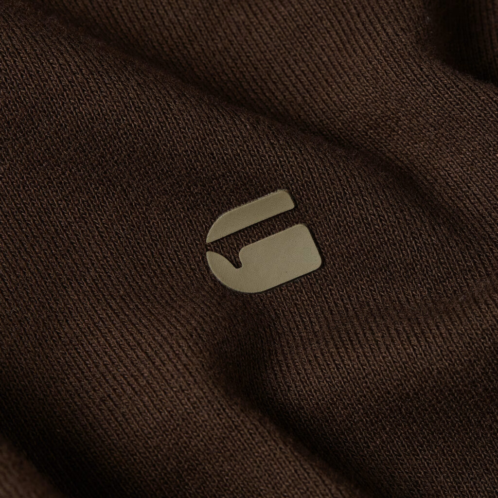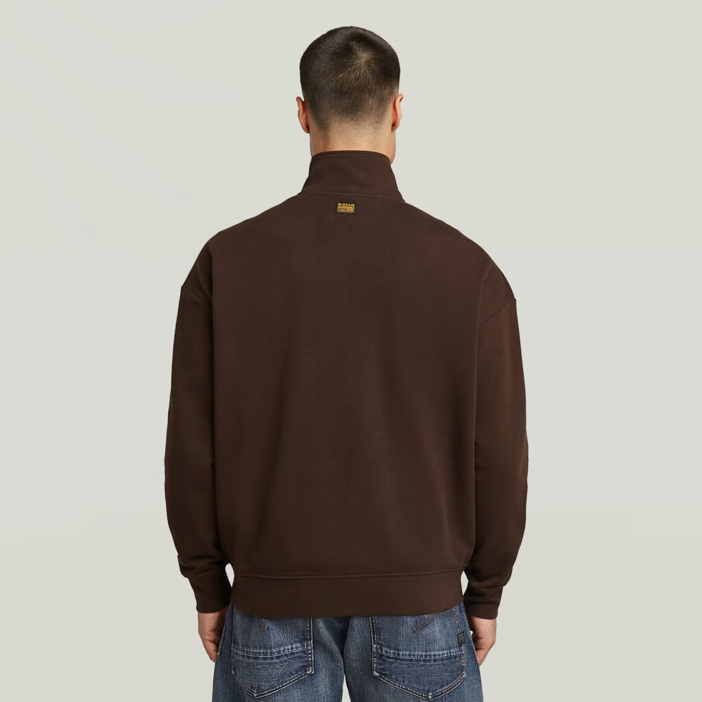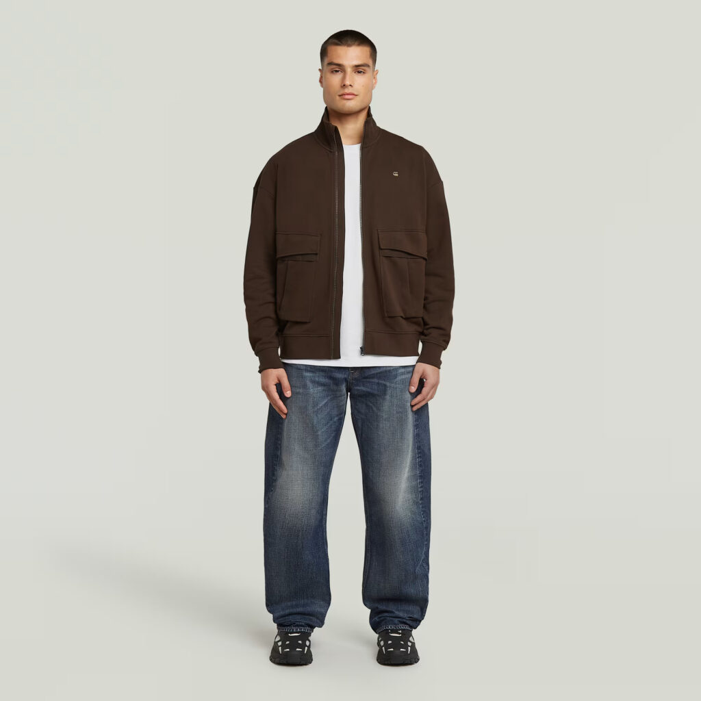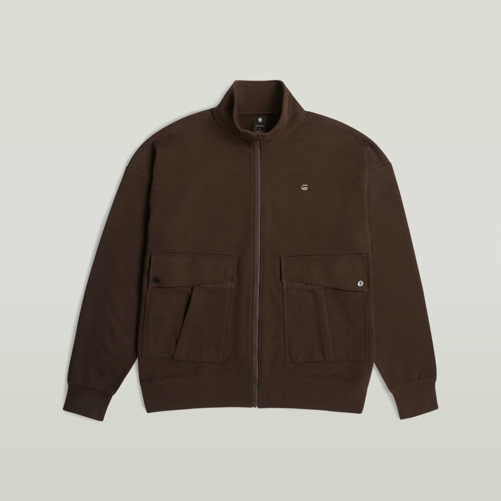 Nīderlandes zīmola G-Star Raw brīva piegriezuma sportiskā stila jaka ar paaugstinātu apkakli tumšā, šokolādes brūnā tonī. Izgatavota no 100% organiskās kokvilnas. Papildināta ar uzšūtām lielizmēra kabatām un zīmola logotipa detaļām.