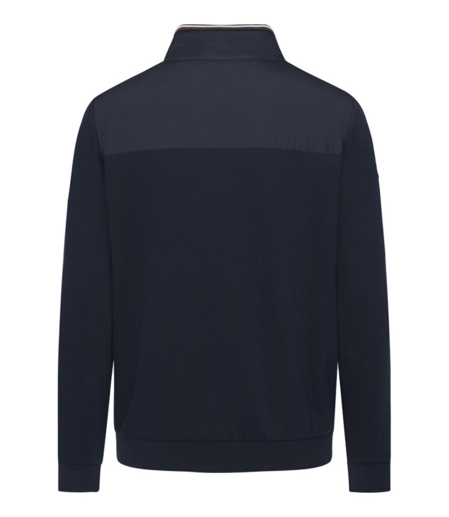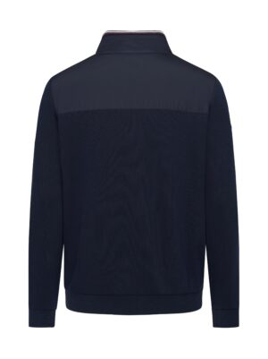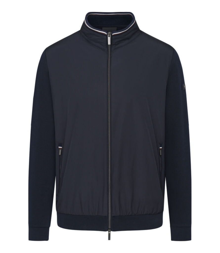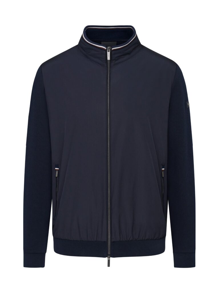 Vācu modes zīmola Bugatti tumši zila kombinētu materiālu jaka ar divvirziena rāvējslēdzēja aizdari. Izgatavota no divu tekstūru kokvilnas maisījuma materiāla. Papildināta ar augstu apkakli un plānu oderi priekšpusē. Akcentēta ar smalki kontrastējošām apdares detaļām un zīmola logotipa emblēmu uz piedurknes.