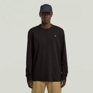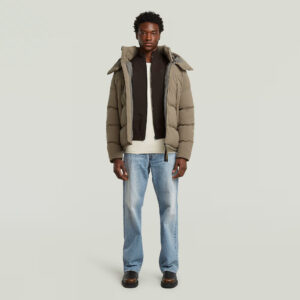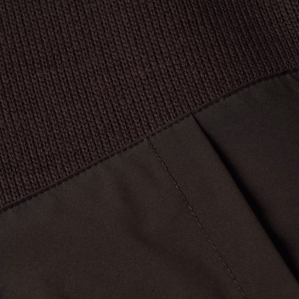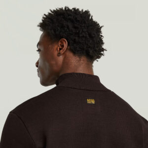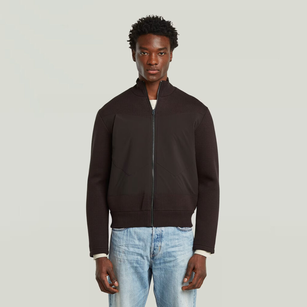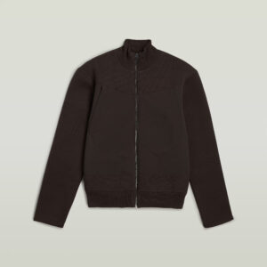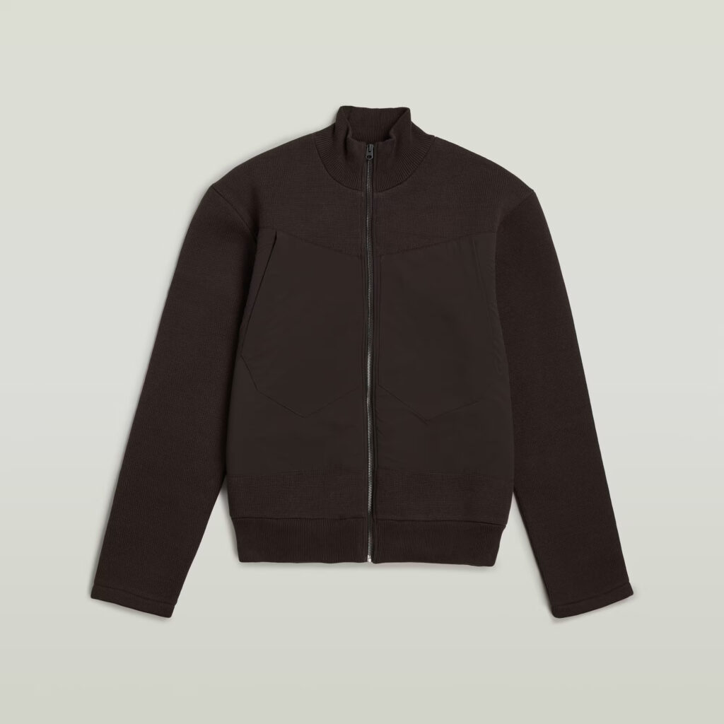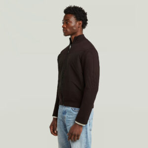 Nīderlandes zīmola G-Star Raw tumši brūna vīriešu virsjaka ar adītu un gludu tekstūru kombināciju. Izgatavota no blīva un bieza organiskās kokvilnas un pārstrādāta poliestera materiāla. Papildināta ar rāvējslēdzēja aizdari, uzšūtām krūšu kabatām un zīmola logotipa akcentiem.