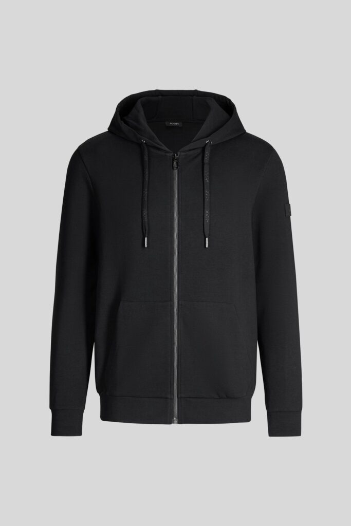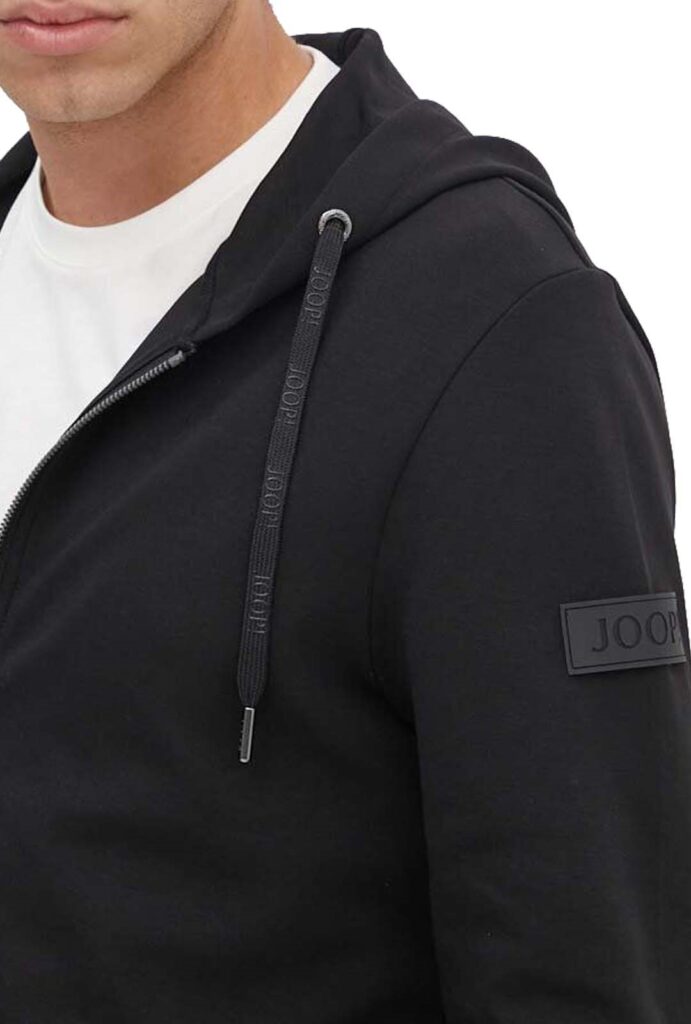 Vācu modes zīmola Joop! melna vīriešu sportiskā stila jaka ar sasienamu kapuci. Izgatavota no elastīga kokvilnas maisījuma materiāla. Papildināta ar sānu kabatām un melnām zīmola logotipa gumijas detaļām.