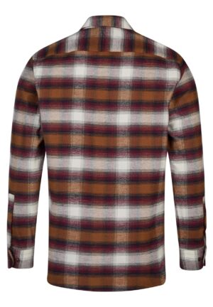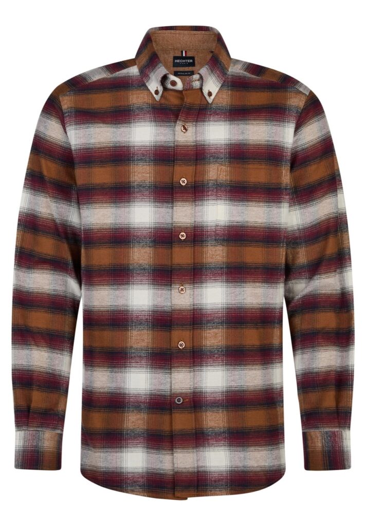 Franču zīmola HECHTER PARIS vīriešu krekls ar izteiksmīgu rūtoto rakstu zeltaini brūnā un gaiši bēšā krāsā ar bordo un tumši ziliem akcentiem. Izgatavots no silta un mīksta augstākās kvalitātes kokvilnas flaneļa. Papildināts ar uzšūtu krūšu kabatu un noapaļotu apakšmalu.