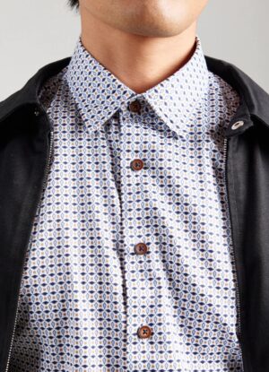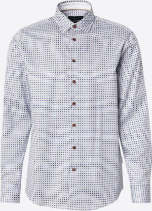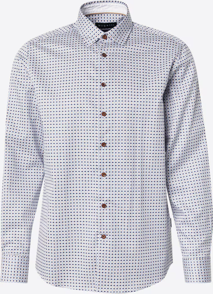 Vācu modes zīmola Bugatti vīriešu krekls ar smalku grafisko rakstu gaiši pelēcīgi zilā krāsā. Izgatavots no 100% augstākās kvalitātes kokvilnas. Papildināts ar kontrastējošu pogu aizdari un dekoratīvu apdari.