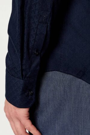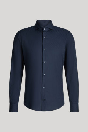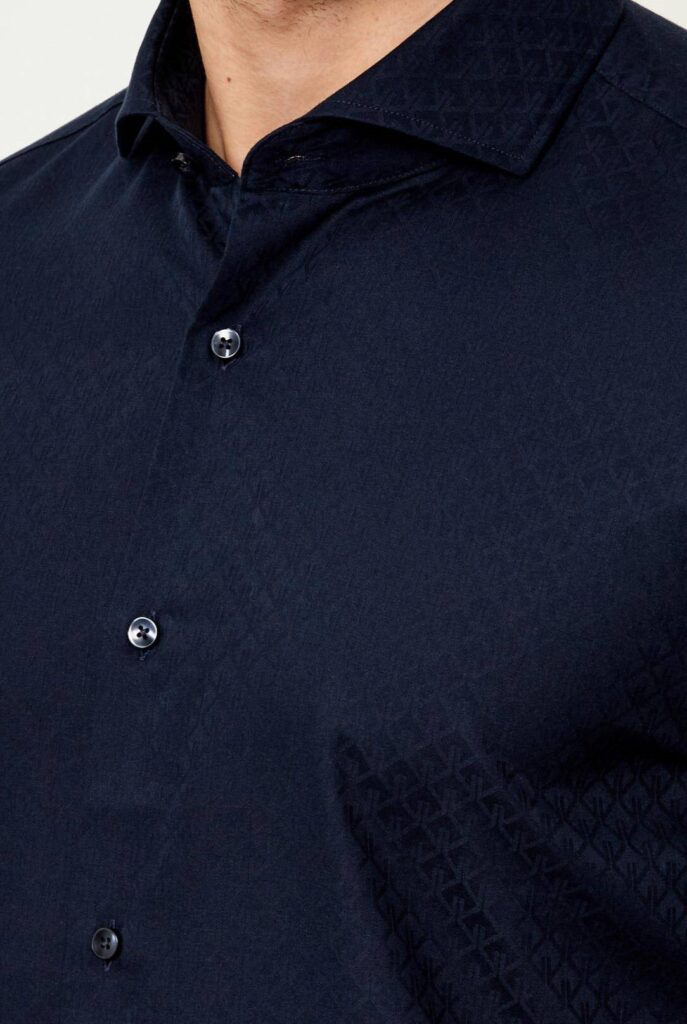 Vācu modes zīmola Joop! viegli pieguļošs vīriešu krekls tumši zilā krāsā ar grafisku vientoņa rakstu. Izgatavots no 100% kokvilnas. Papildināts ar noapaļotu apakšmalu un askētisku zīmola logotipa izšuvumu uz piedurknes.