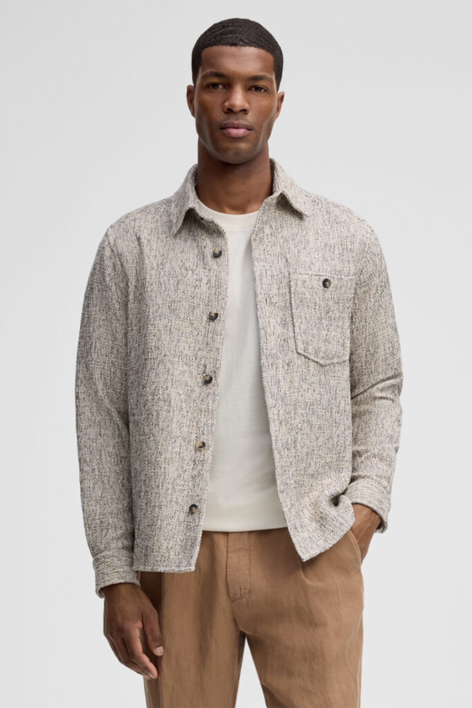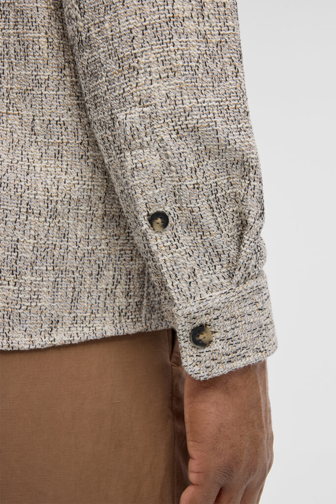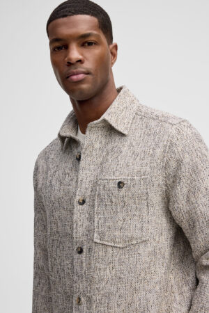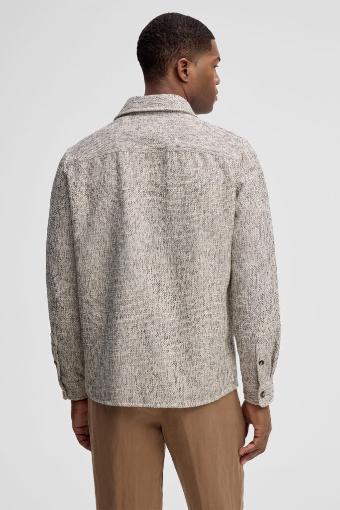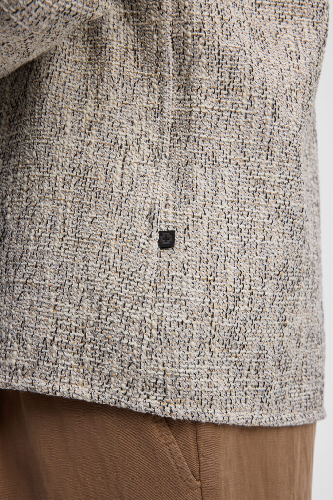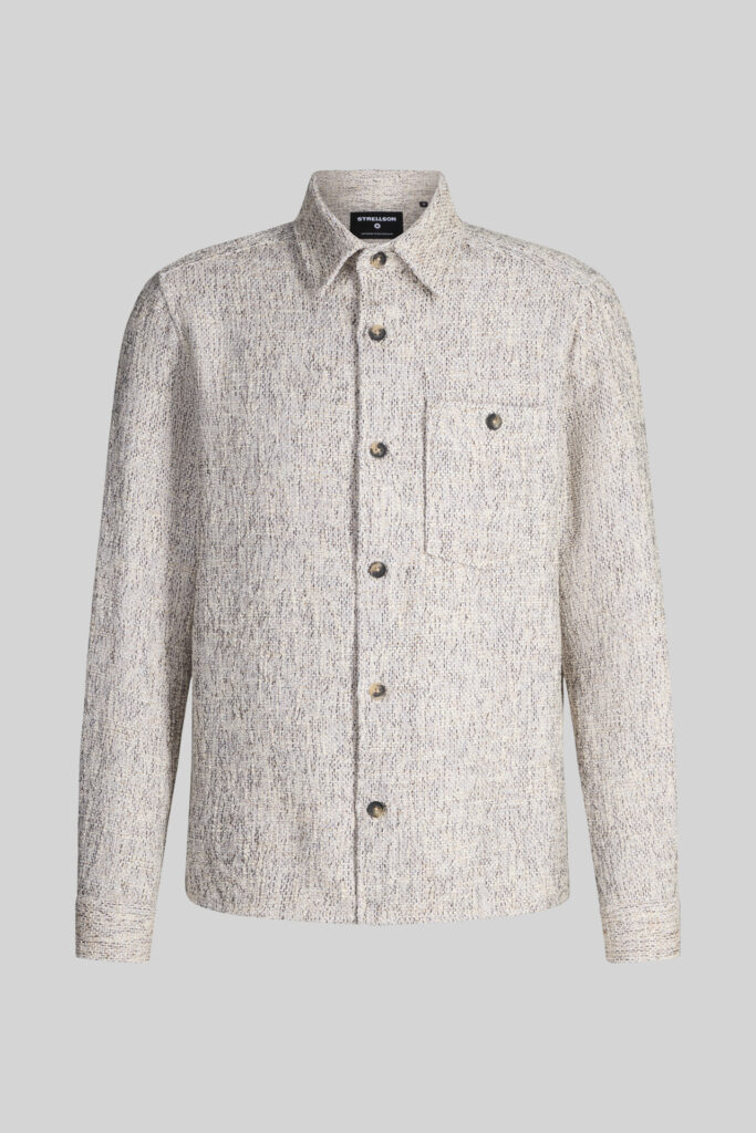 Šveices modes zīmola Strellson vīriešu virskrekls ar smalki raibu rakstu pelēcīgi bēšos toņos. Izgatavots no kokvilnas maisījuma materiāla ar raupji austu tekstūru. Papildināts ar uzšūtu krūšu kabatu un smalku zīmola logotipa emblēmas akcentu sānā.