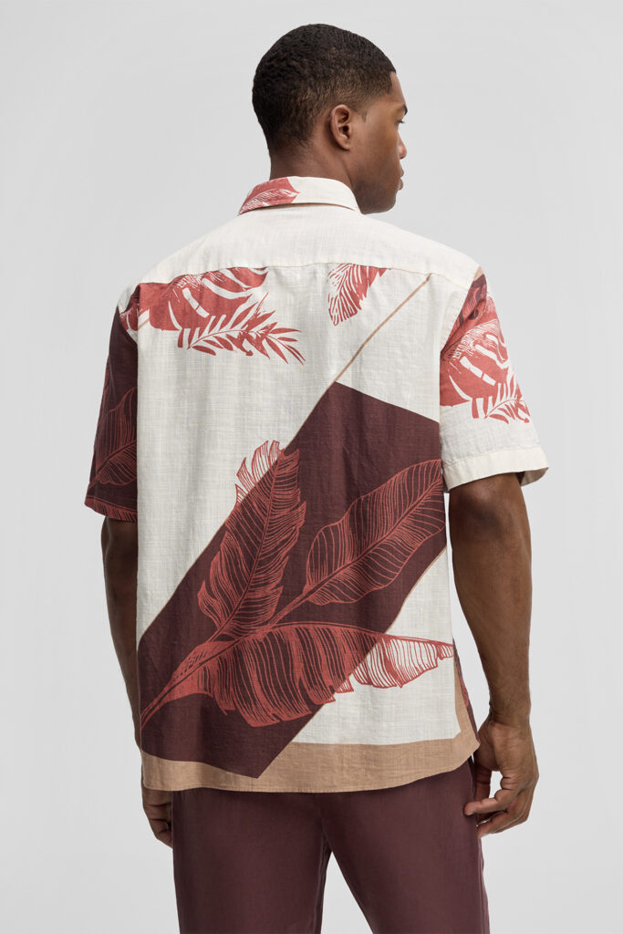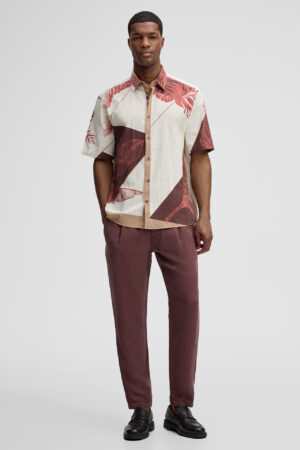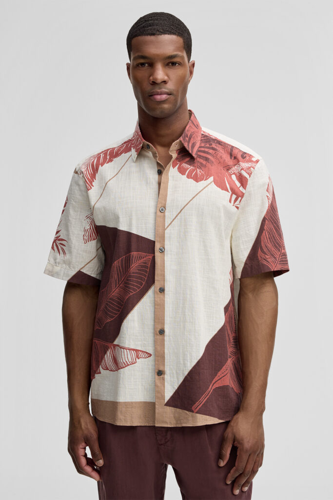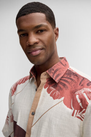 Šveices modes zīmola Strellson komfortabls vīriešu krekls ar augu motīva dizaina apdruku bēšos un tumši sarkanos toņos. Izgatavots no 100% kokvilnas ar dekoratīvu tekstūru. Papildināts ar viegli kontrastējošu aizdari un īsām piedurknēm.