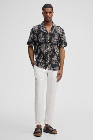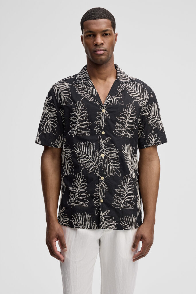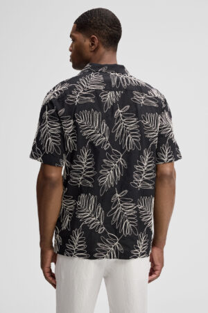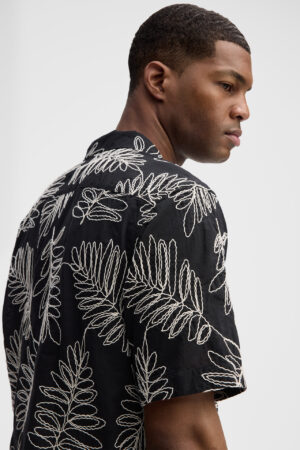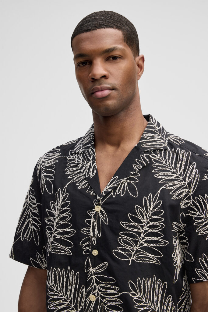 Šveices modes zīmola Strellson melns vīriešu krekls ar dekoratīviem augu motīvu izšuvumiem. Izgatavots no kokvilnas maisījuma materiāla. Papildināts ar īsām piedurknēm un V veida kakla izgriezumu ar apkakles atlokiem.