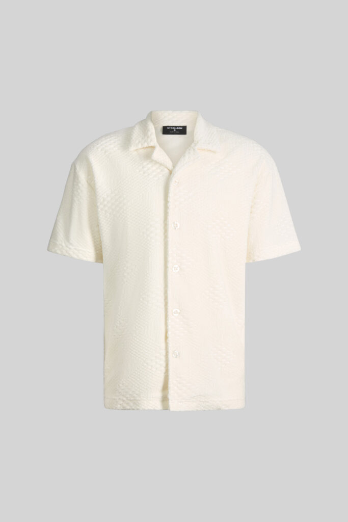Šveices modes zīmola Strellson krēmbalts brīva piegriezuma vīriešu krekls ar dekoratīvu rombveida tekstūras rakstu. Izgatavots no kokvilnas maisījuma materiāla ar samtainu frotē struktūru. Papildināts ar īsām piedurknēm, V veida kakla izgriezumu un apkakles atlokiem.