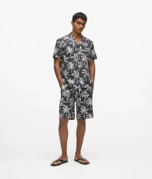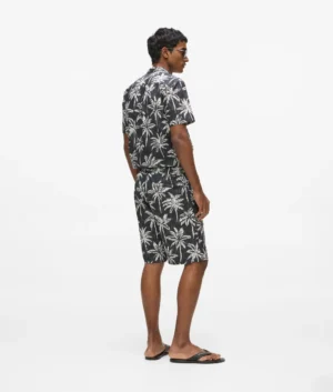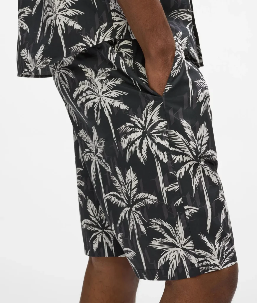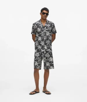 Vācu luksusa zīmola Karl Lagerfeld melni vīriešu šorti ar tropisko palmu un zīmola monogrammu raksta apdruku. Izgatavoti no 100% augstākās kvalitātes kokvilnas. Papildināti ar elastīgu, iekšpusē sasienamu jostasvietu un kabatām.