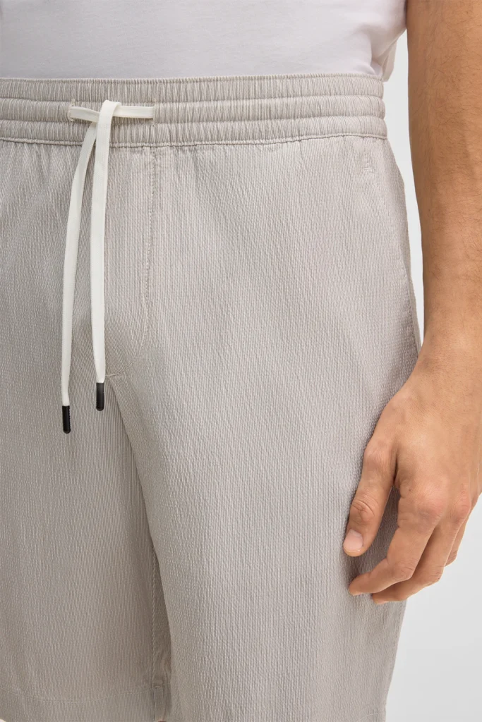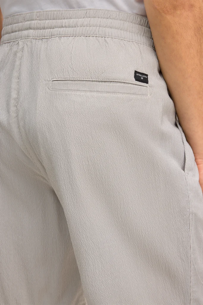 Šveices modes zīmola Strellson vīriešu šorti gaiši pelēcīgi bēšā krāsā. Izgatavoti no elastīga liocela materiāla ar sīki rievotu struktūru. Papildināti ar sasienamu, elastīgu jostasvietu. Akcentēti ar smalkām zīmola logotipa detaļām.