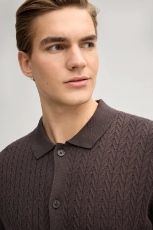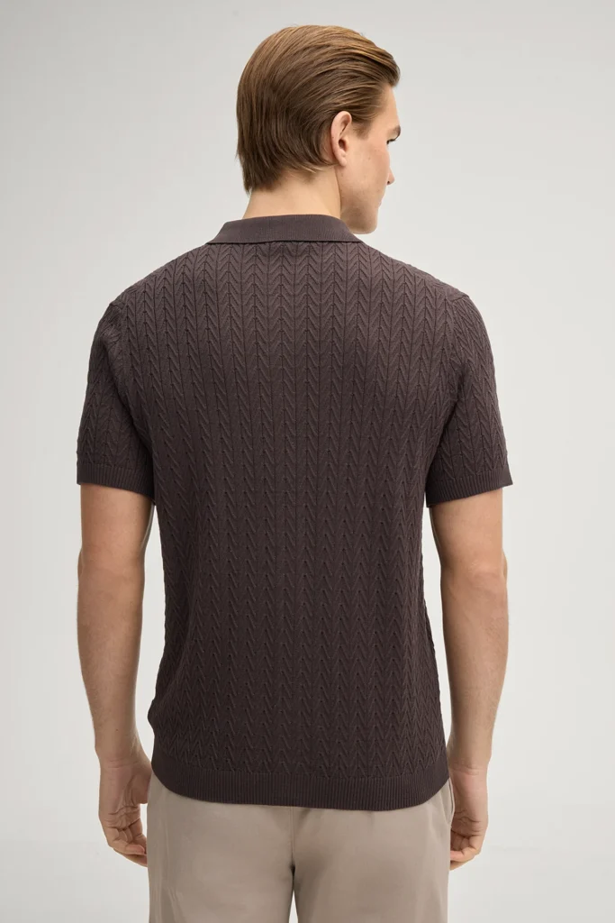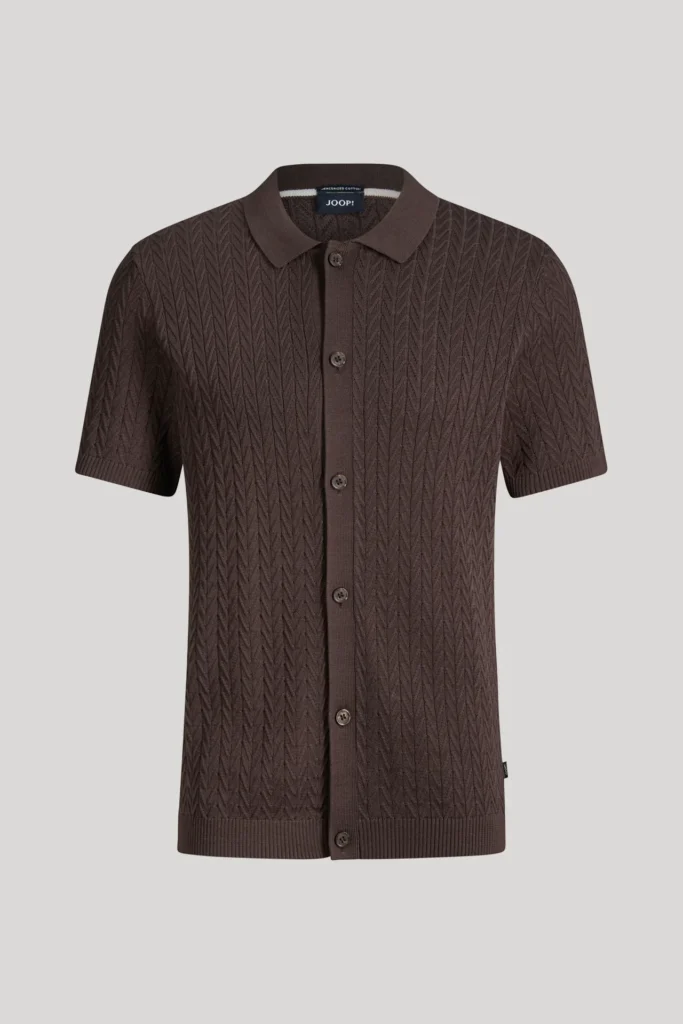 Vācu modes zīmola Joop! vīriešu krekls ar īsām piedurknēm šokolādes brūnā tonī. Izgatavots no 100% kokvilnas dekoratīva adījuma rakstā. Papildināts ar smalki rievotu apdari un zīmola logotipa emblēmu sānu vīlē.