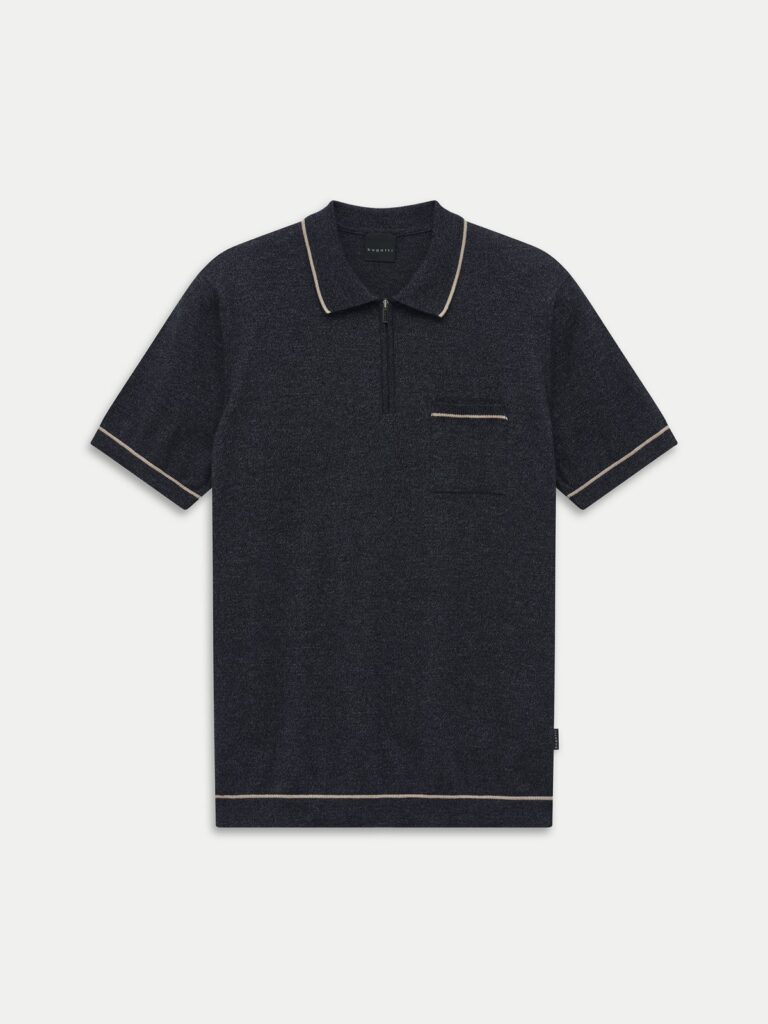 Vācu modes zīmola Bugatti tumši zilpelēks smalka adījuma polo krekls vīriešiem. Izgatavots no plāna kokvilnas maisījuma materiāla ar viegli raibu struktūru. Papildināts ar rāvējslēdzēja aizdari un uzšūtu krūšu kabatiņu. Akcentēts ar kontrastējošu svītru apdari un zīmola emblēmu sānu vīlē.