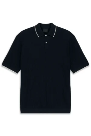 Vācu modes zīmola Bugatti tumši zils vīriešu polo krekls ar īsām piedurknēm. Izgatavots no kokvilnas maisījuma materiāla ar modernu dekoratīva adījuma tekstūru. Akcentēts ar kontrastējošu apkakles un aproču apdari.