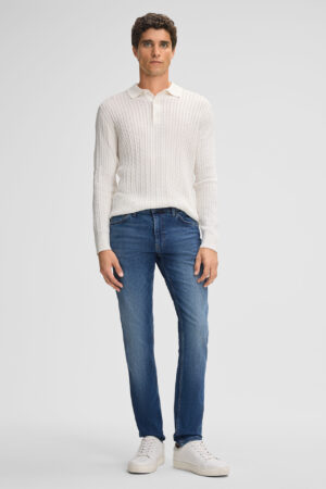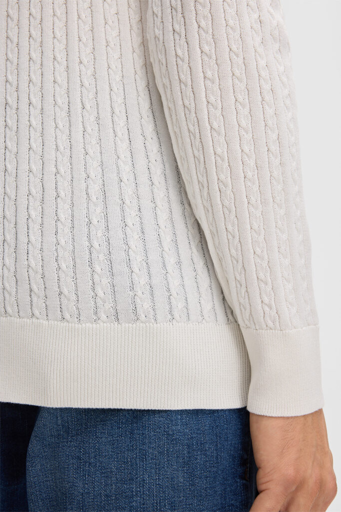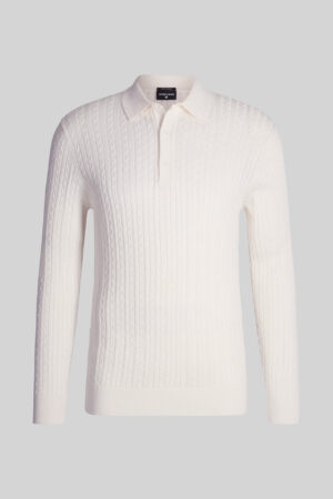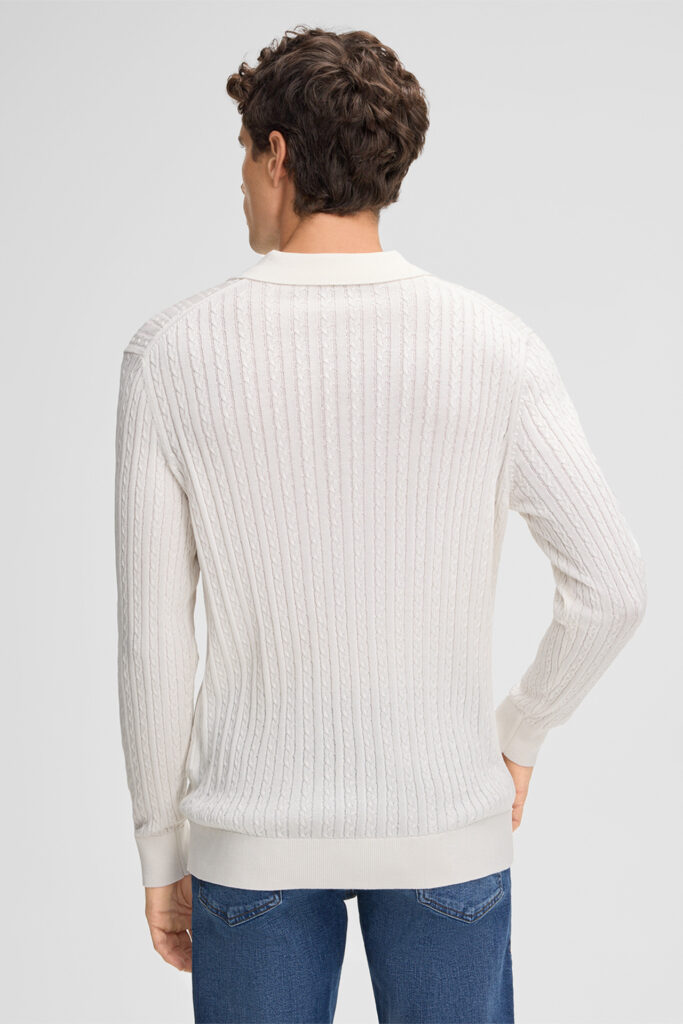Šveices modes zīmola Strellson krēmbalts vīriešu džemperis ar vertikālu adījuma rakstu. Izgatavots no 100% organiskās kokvilnas. Papildināts ar polo stila apkakli un smalki rievotu apdari.