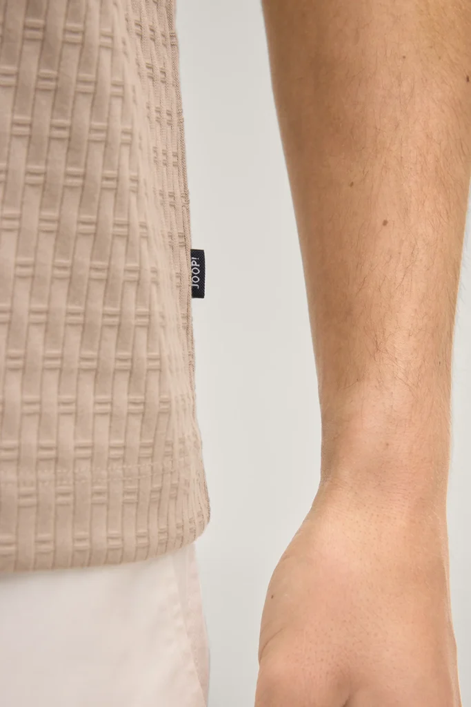 Vācu modes zīmola Joop! pelēcīgi bēšs vīriešu polo krekls ar 2 pogu aizdari. Izgatavots no 100% kokvilnas ar dekoratīvu grafisko struktūru. Papildināts ar zīmola emblēmas akcentu sānu vīlē.