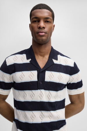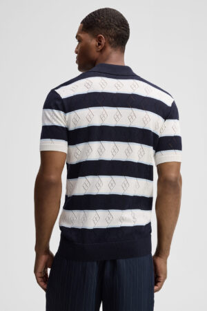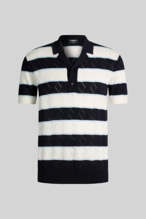 Šveices modes zīmola Strellson vīriešu polo krekls ar dekoratīvām horizontālajām joslām baltā un tumši zilā krāsā. Izgatavots no 100% organiskās kokvilnas. Papildināts ar perforētas tekstūras rakstu un V veida izgriezumu ar atlokiem.