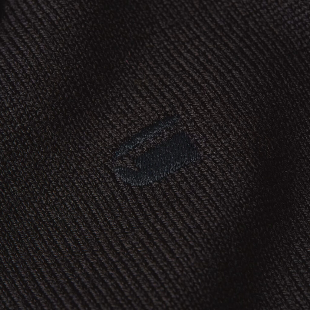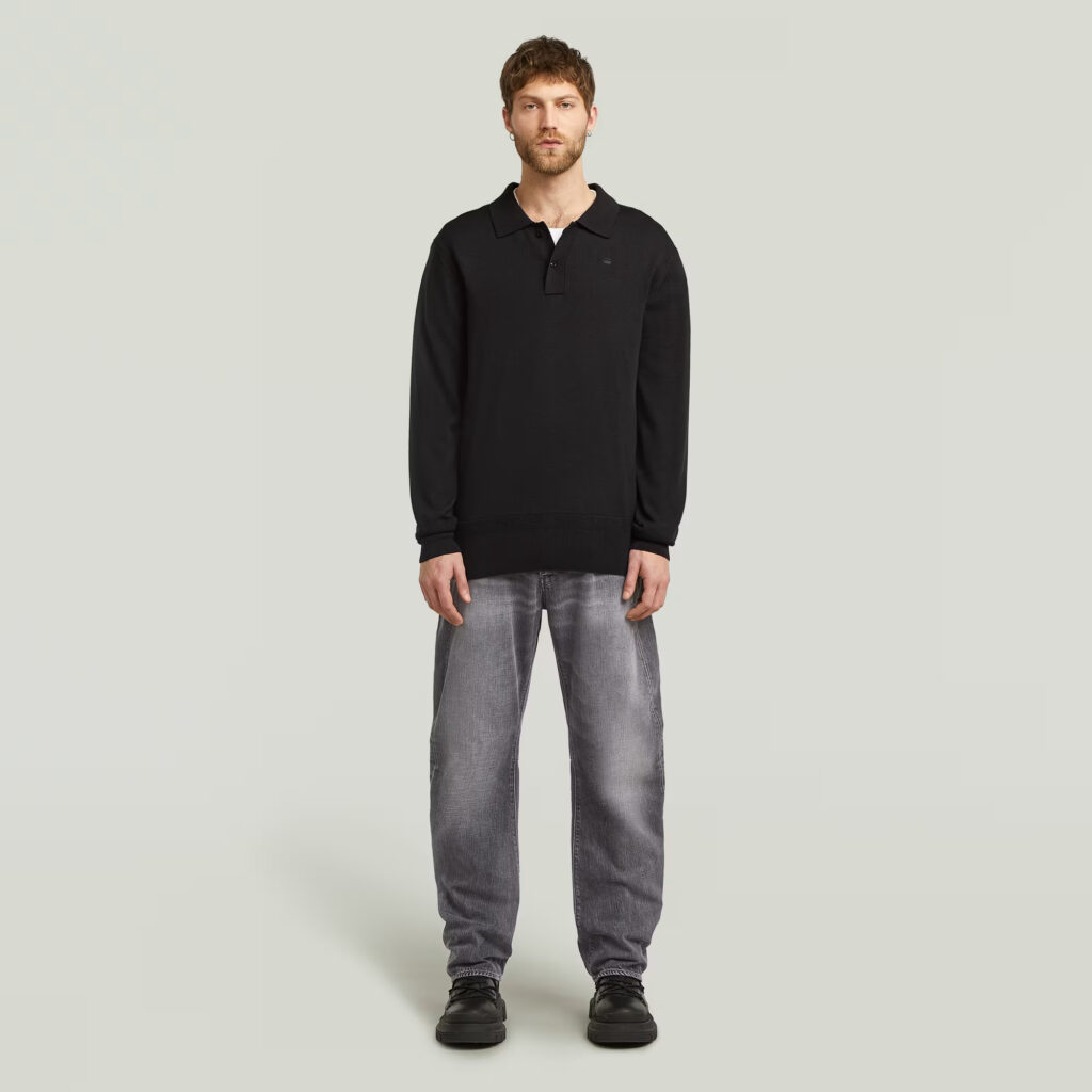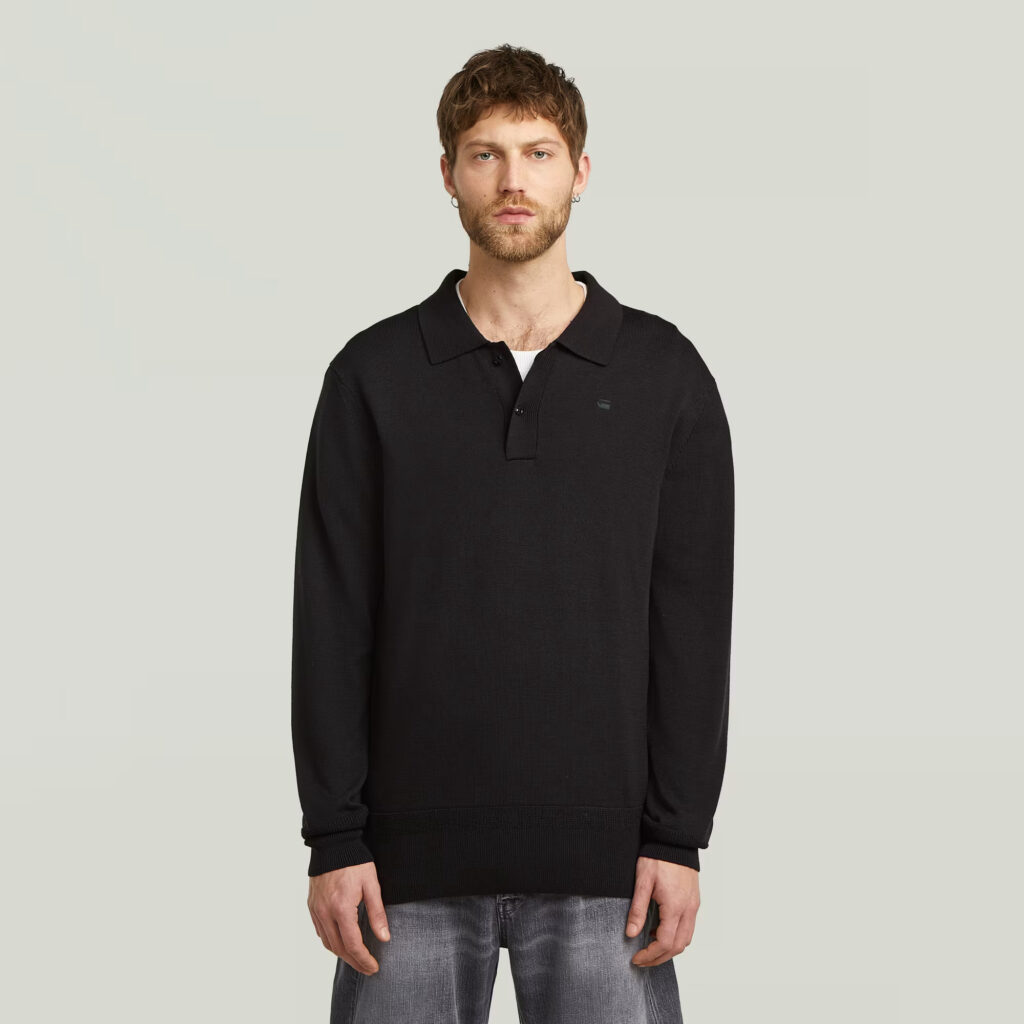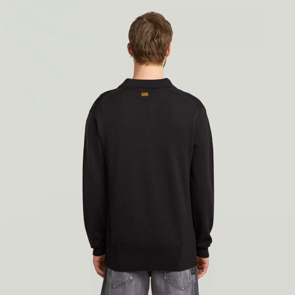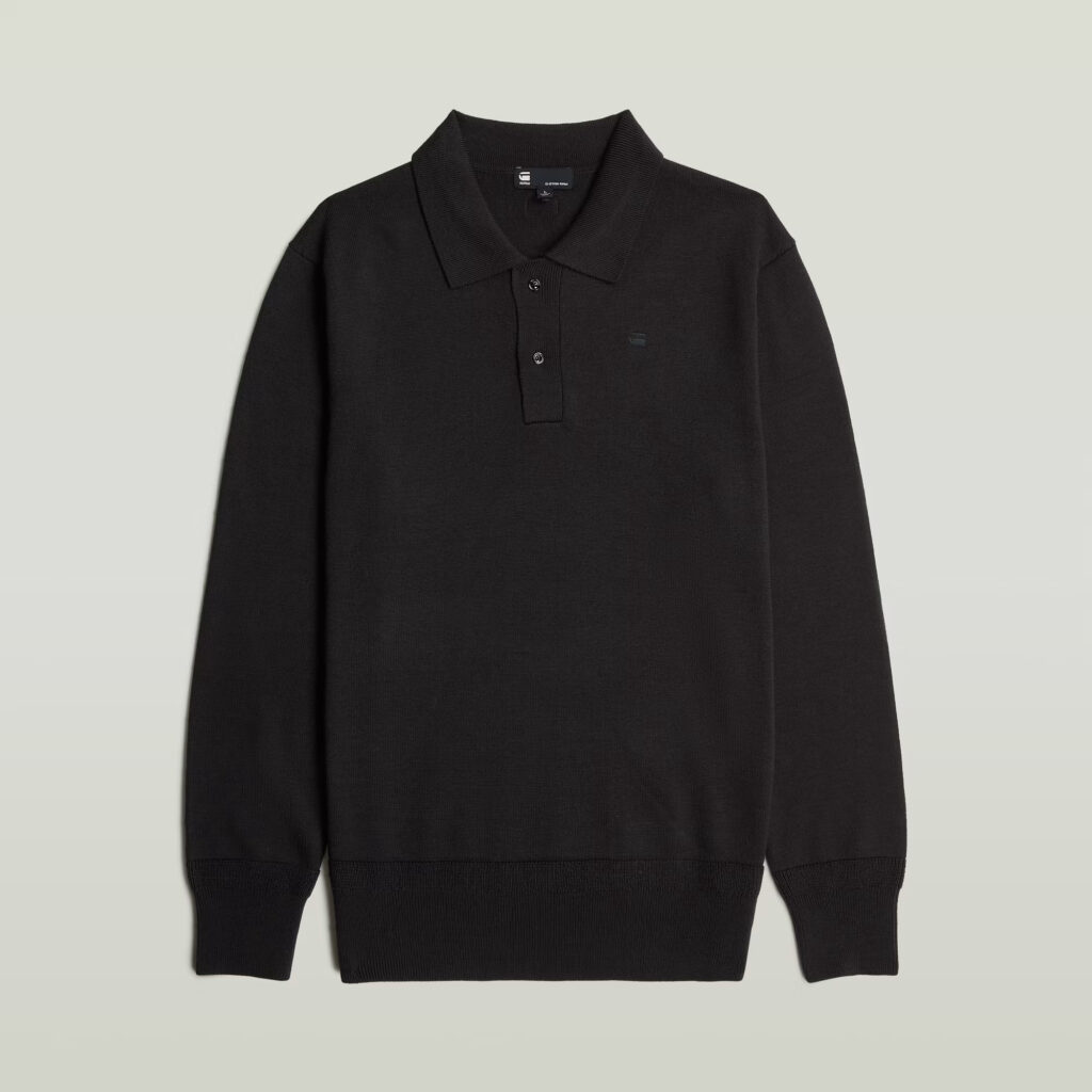Nīderlandes zīmola G-Star Raw melns smalka adījuma vīriešu džemperis ar polo apkakli un pogu aizdari. Izgatavots no mīkstas merino vilnas dzijas. Papildināts ar askētisku vientoņa logo izšuvumu un smalki rievotu apdari.