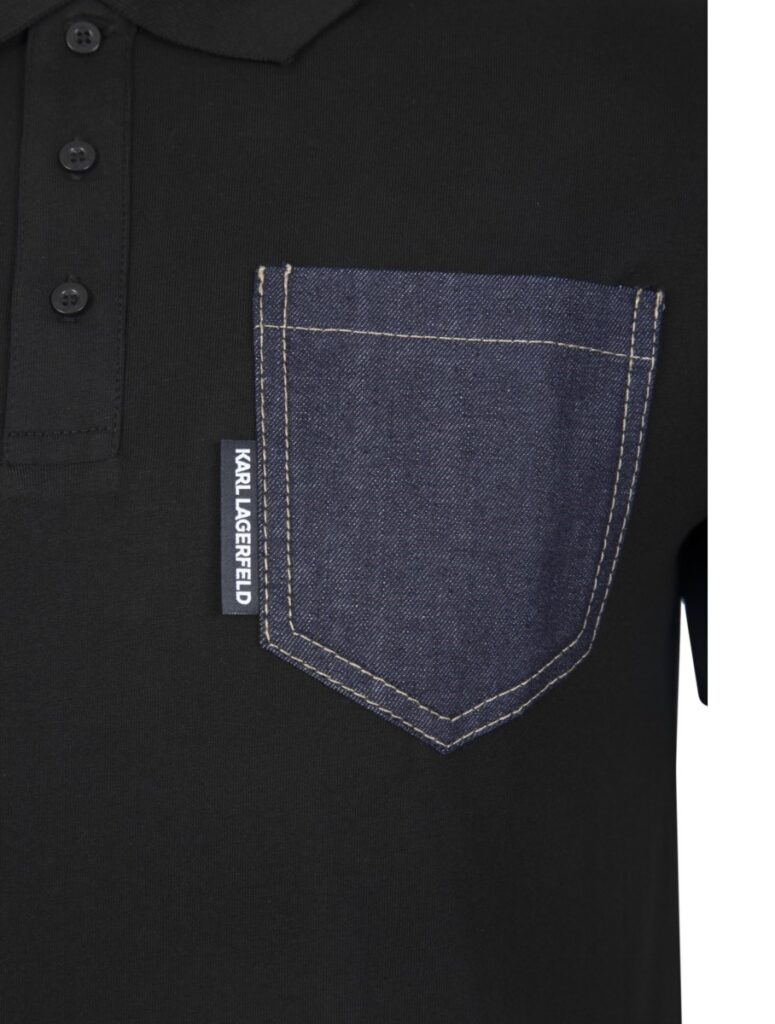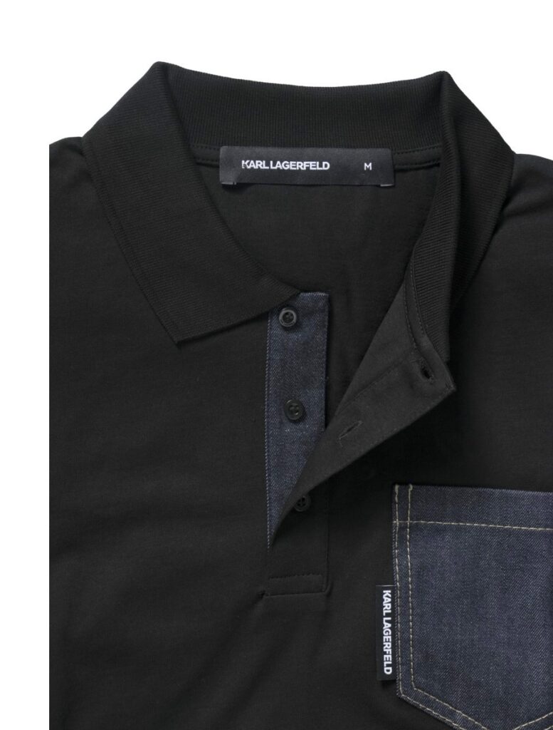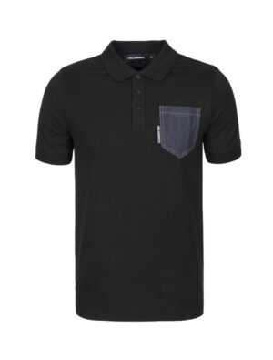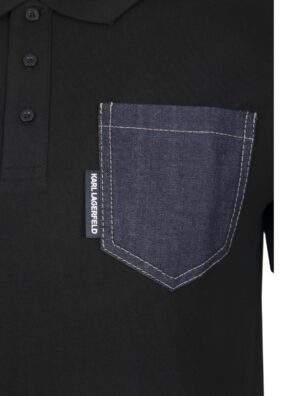 Vācu luksusa zīmola Karl Lagerfeld klasisks vīriešu polo krekls melnā krāsā. Izgatavots no 100% augstākās kvalitātes kokvilnas. Akcentēts ar uzšūtu zilu džinsu kabatu un melnbaltu zīmola logotipa emblēmu.