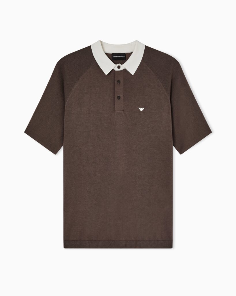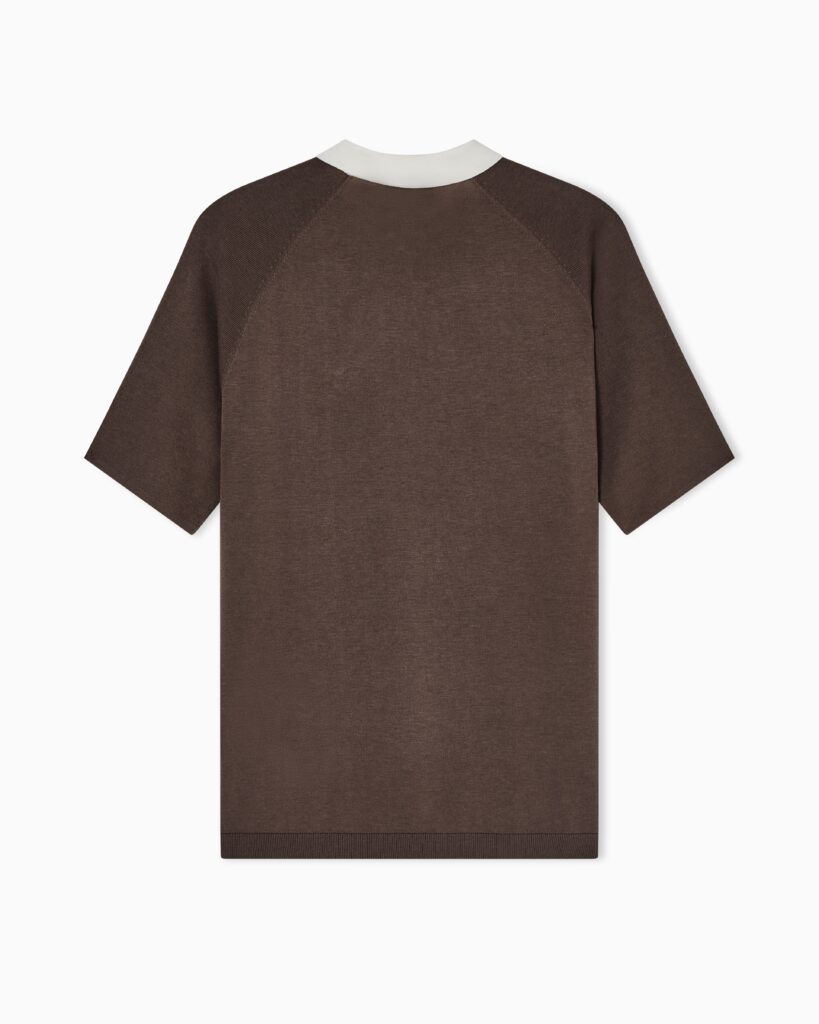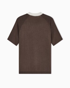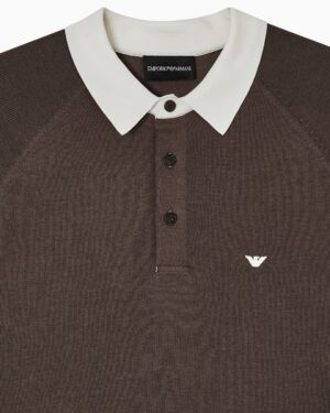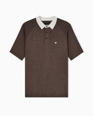 Itāļu luksusa zīmola Emporio Armani pelēcīgi brūns vīriešu polo krekls ar īsām reglāna piedurknēm. Izgatavots no smalka kokvilnas, liocela un zīda trikotāžas materiāla. Akcentēts ar kontrastējošu apkakli un zīmola logotipa- ērgļa izšuvumu.