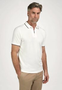 Itāļu luksusa zīmola Emporio Armani vīriešu polo krekls bēšā krāsā. Izgatavots no teksturētas kokvilnas ar mikroperforētu virspusi. Papildināts ar rāvējslēdzēja aizdari un nelieliem sānu sķēlumiem, kā arī smalku zīmola logotipa- ērgļa izšuvumu.