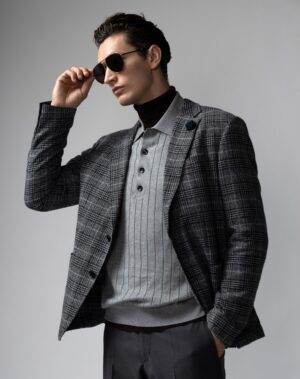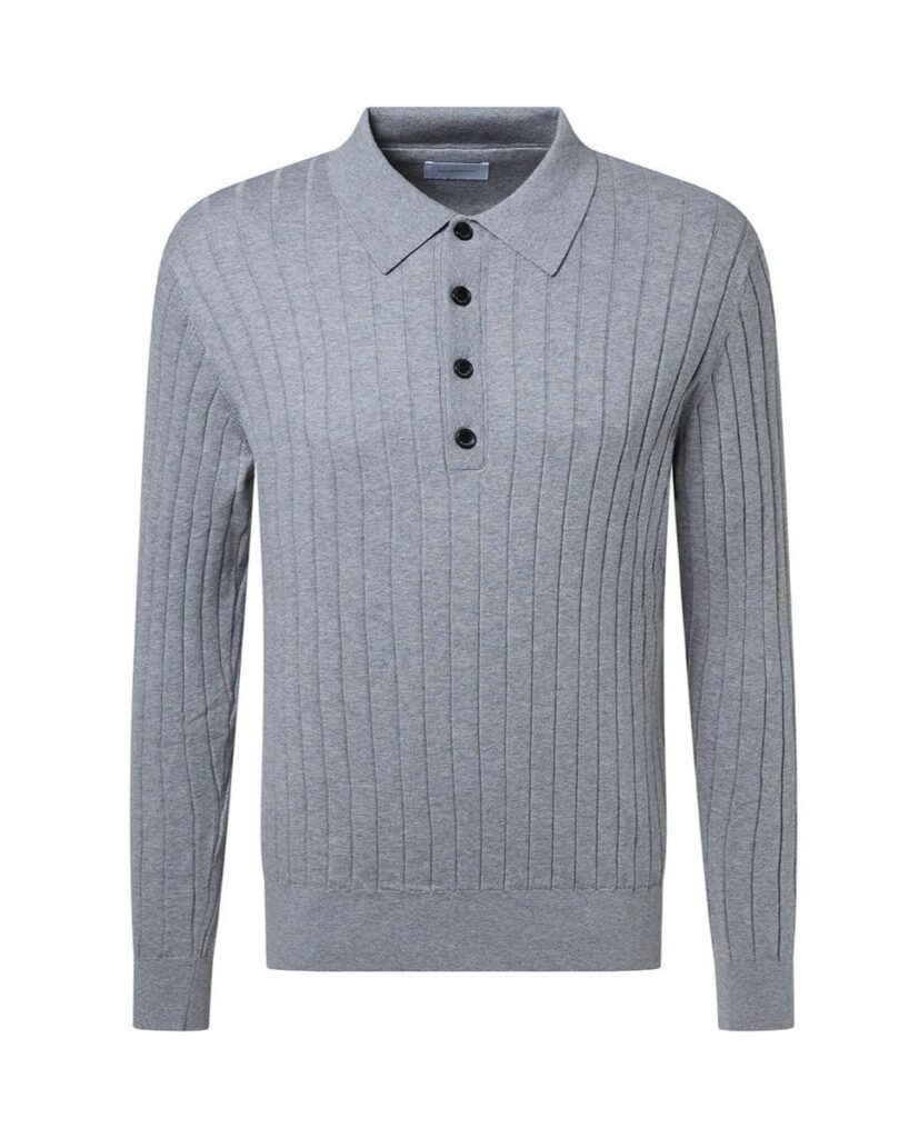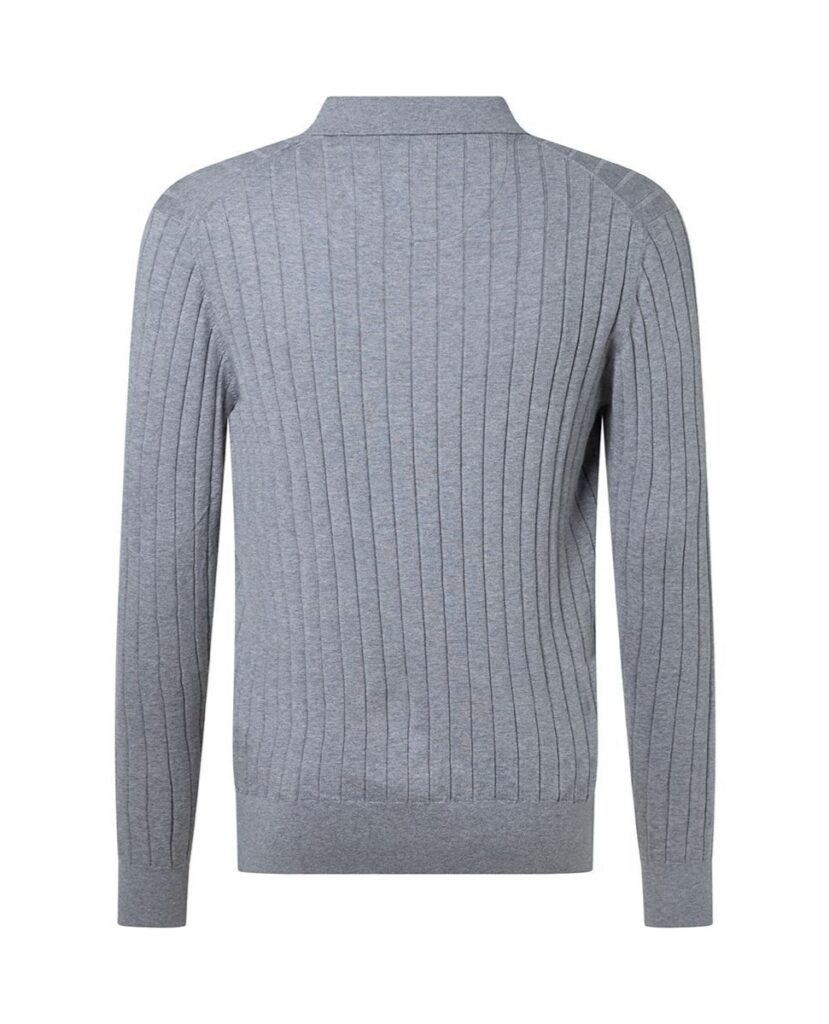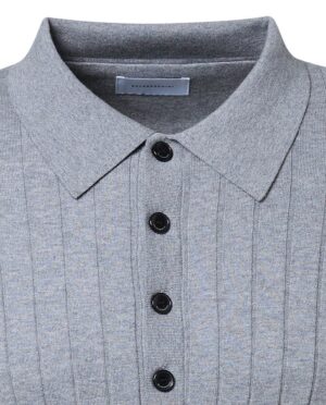Austriešu premium klases modes zīmola Baldessarini adīts vīriešu džemperis pelēkā krāsā. Izgatavots no smalkas kokvilnas, zīda un kašmira dzijas vertikālā adījuma rakstā. Papildināts ar polo stila apkakli un zīmola pogu aizdari.