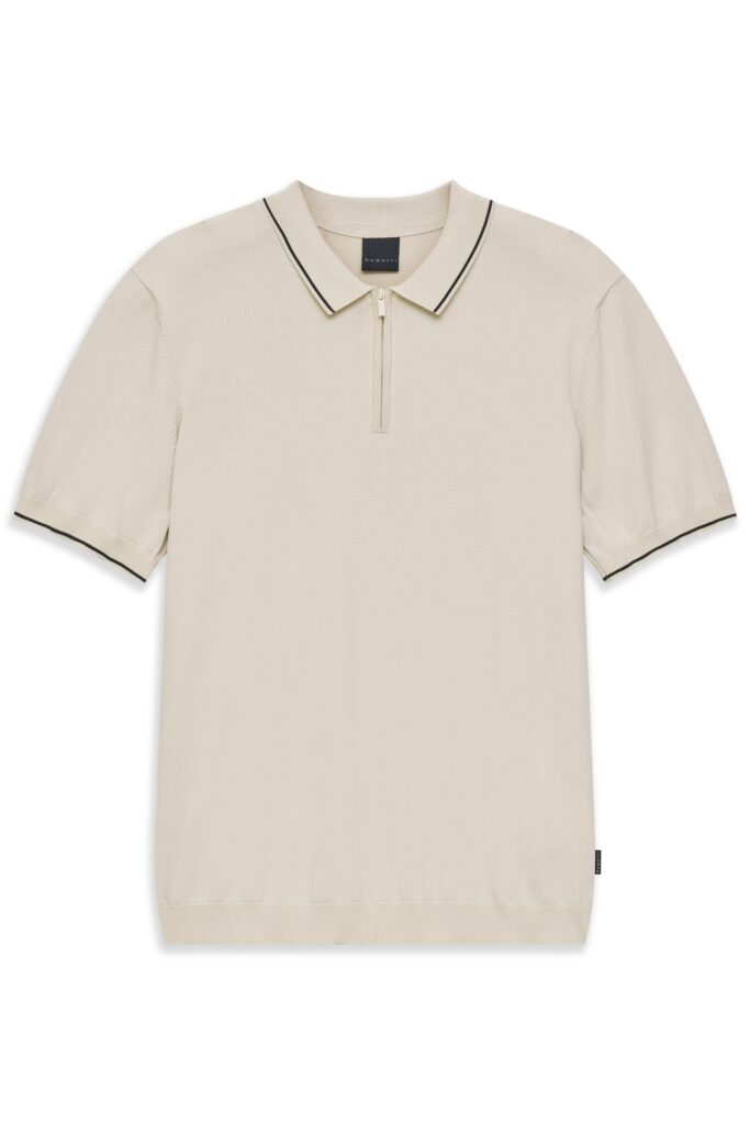 - Apaļš kakla izgriezums ar polo apkakli un rāvējslēdzēja aizdari