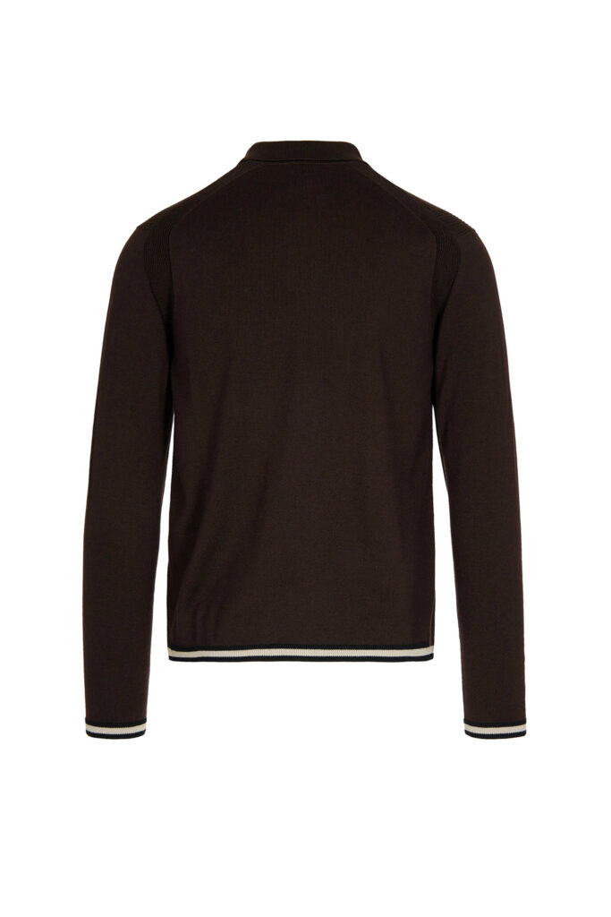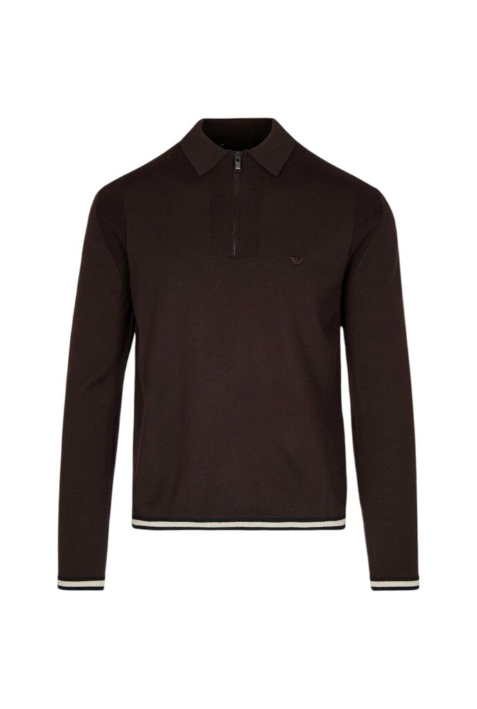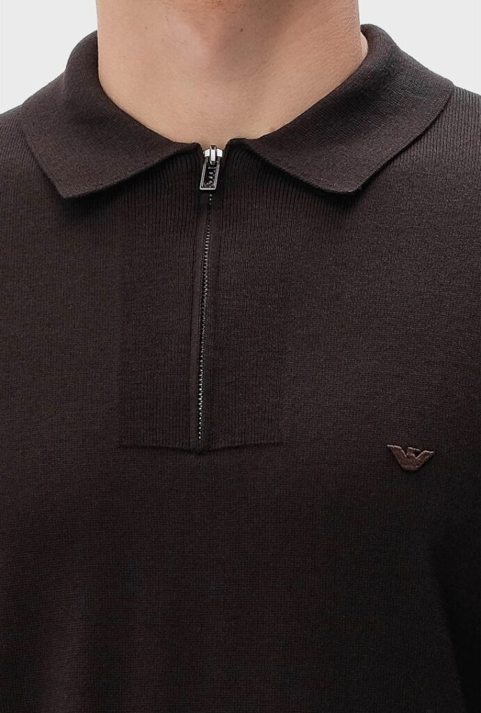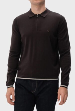 Itāļu luksusa zīmola Emporio Armani plāna adījuma polo stila džemperis tumši brūnā krāsā. Izgatavots no smalkas jaunvilnas dzijas. Papildināts ar rievotas struktūras akcentiem, kontrastējošu aproču un apakšmalas apdari, kā arī smalku ikoniskā ērgļa logo izšuvumu.