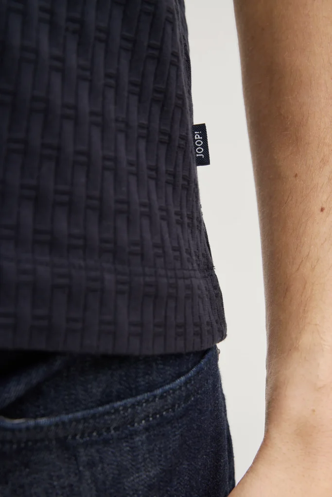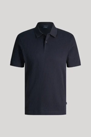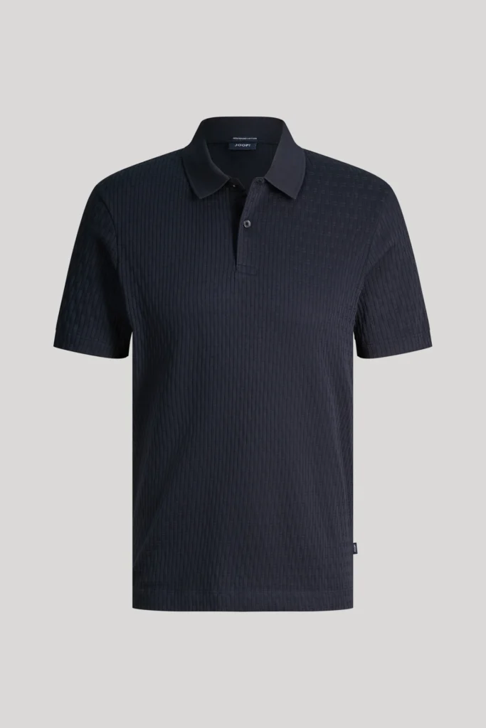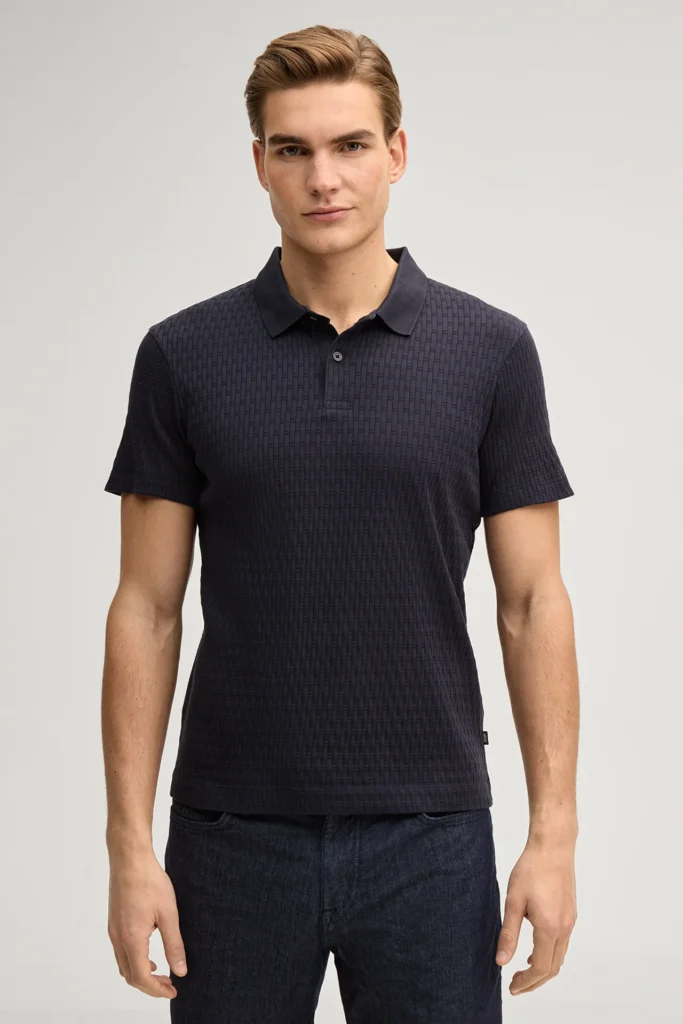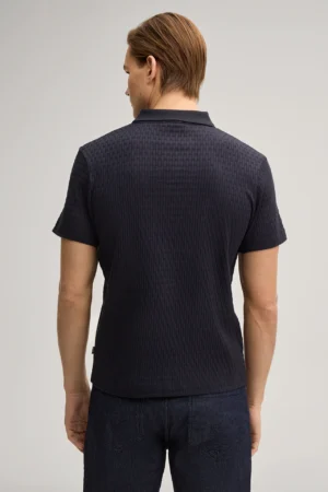 Vācu modes zīmola Joop! tumši zils vīriešu polo krekls ar 2 pogu aizdari. Izgatavots no 100% kokvilnas ar dekoratīvu grafisko struktūru. Papildināts ar zīmola emblēmas akcentu sānu vīlē.