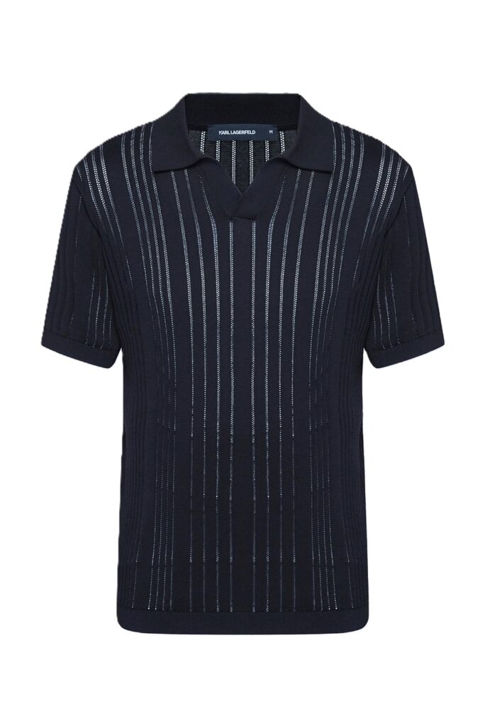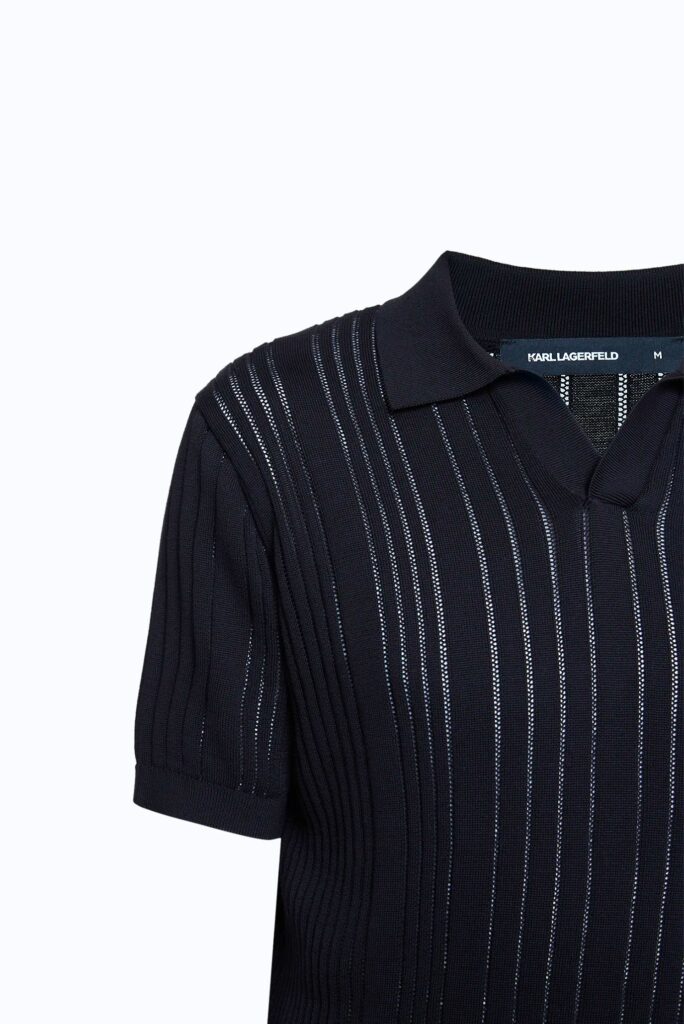 Vācu luksusa zīmola Karl Lagerfeld smalka adījuma polo krekls ar V veida kakla izgriezumu tumši zilā krāsā. Izgatavots no 100% kokvilnas ar viegli caurpīdīgu vertikālo svītru rakstu. Papildināts ar smalki rievotu apdari. Akcentēts ar zīmola metāla piespraudi apakšmalā.