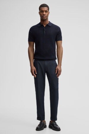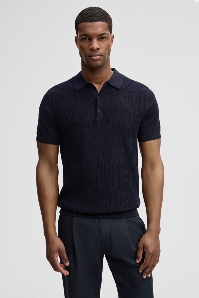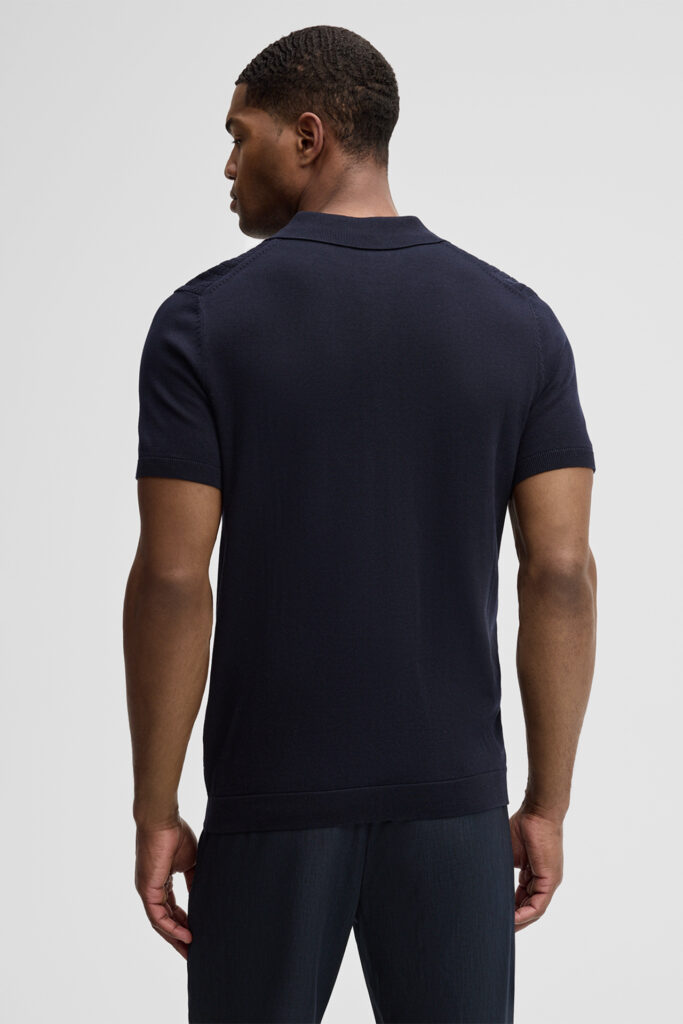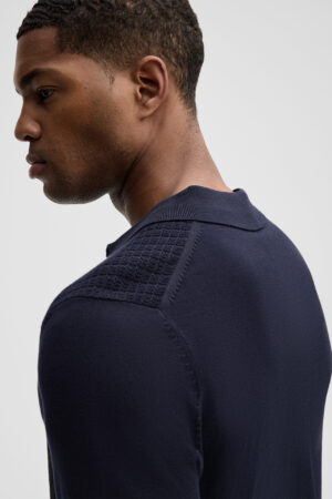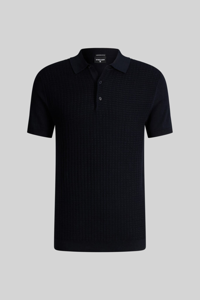 Šveices modes zīmola Strellson vīriešu polo krekls tumši zilā krāsā. Izgatavots no organiskās kokvilnas ar dekoratīva adījuma tekstūru priekšpusē. Papildināts ar smalki rievotu apdari.