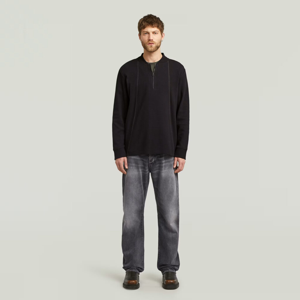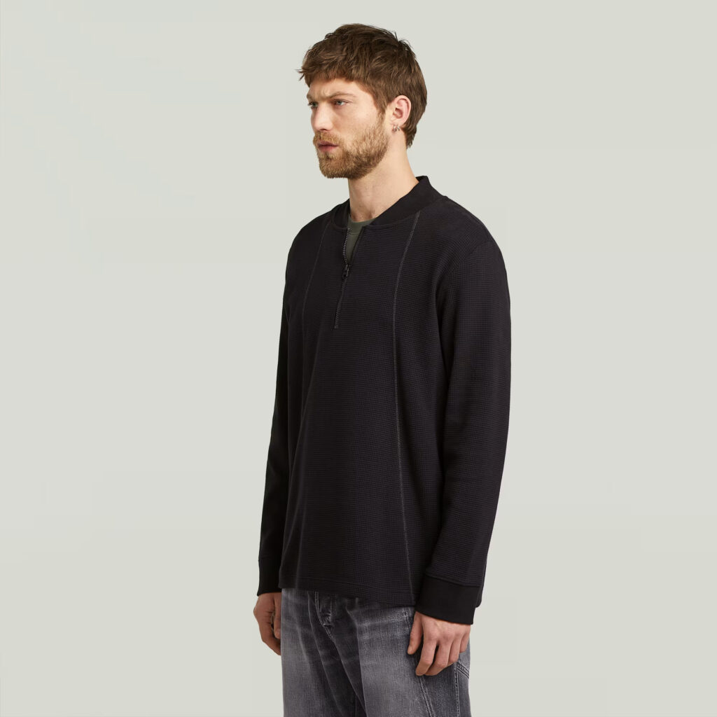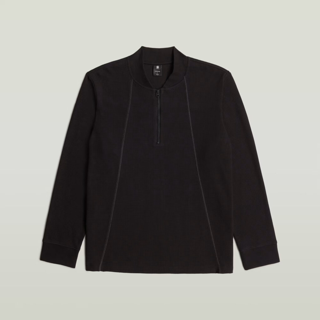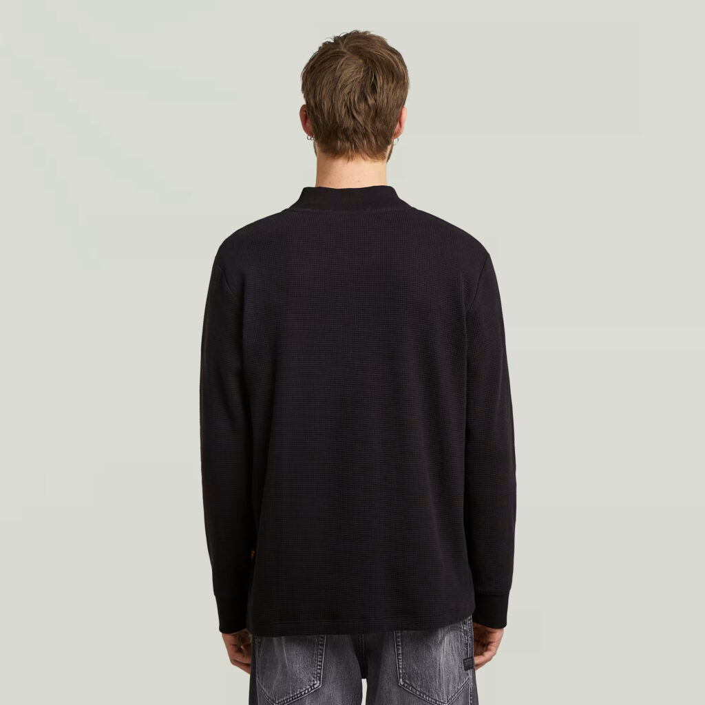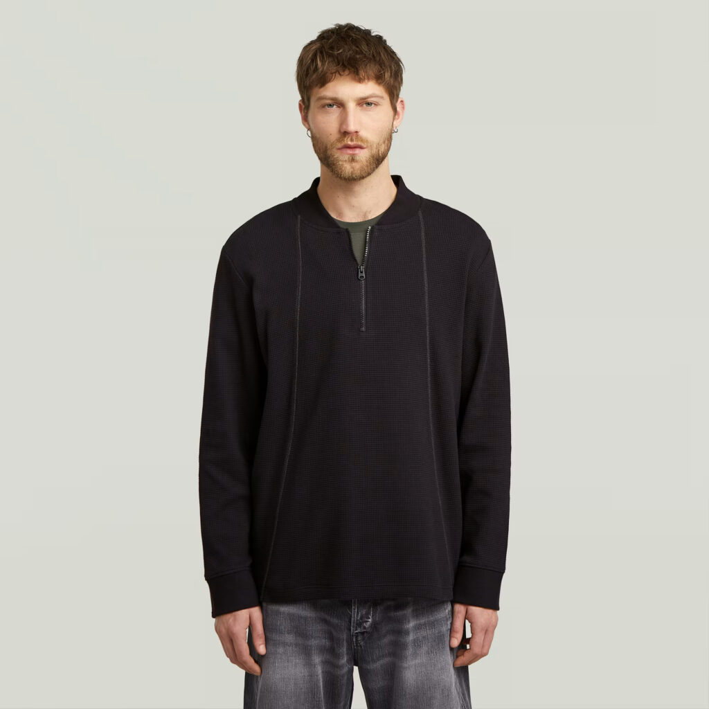 Nīderlandes zīmola G-Star Raw melns brīva piegriezuma vīriešu džemperis ar nedaudz paaugstinātu apkakli un rāvējslēdzēja aizdari. Izgatavots no viegla organiskās kokvilnas materiāla ar smalki rievotu tekstūru. Papildināts ar dekoratīvām A silueta nošuvēm un kontrastējošu zīmola emblēmu apakšmalā.