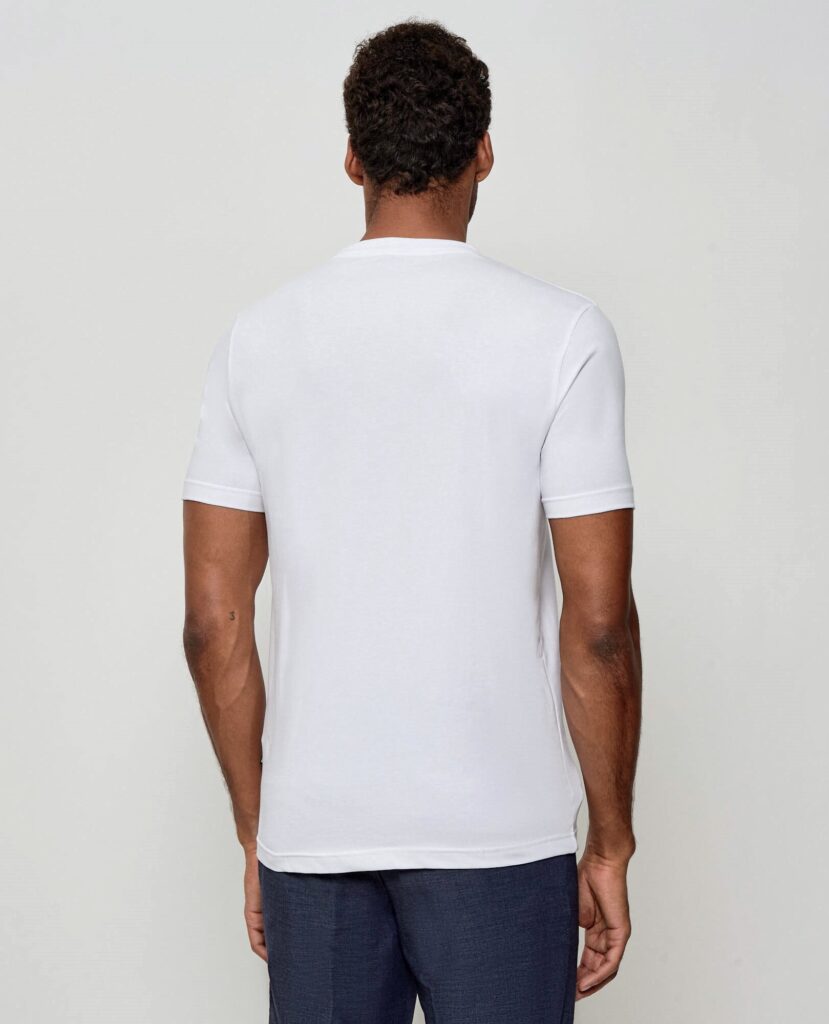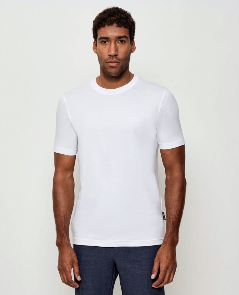 Franču zīmola HECHTER PARIS vīriešu T-krekls baltā krāsā ar smalku vintage stila logotipa vientoņa izšuvumu. Izgatavots no elastīga kokvilnas materiāla. Papildināts ar zīmola emblēmu sānu vīlē.