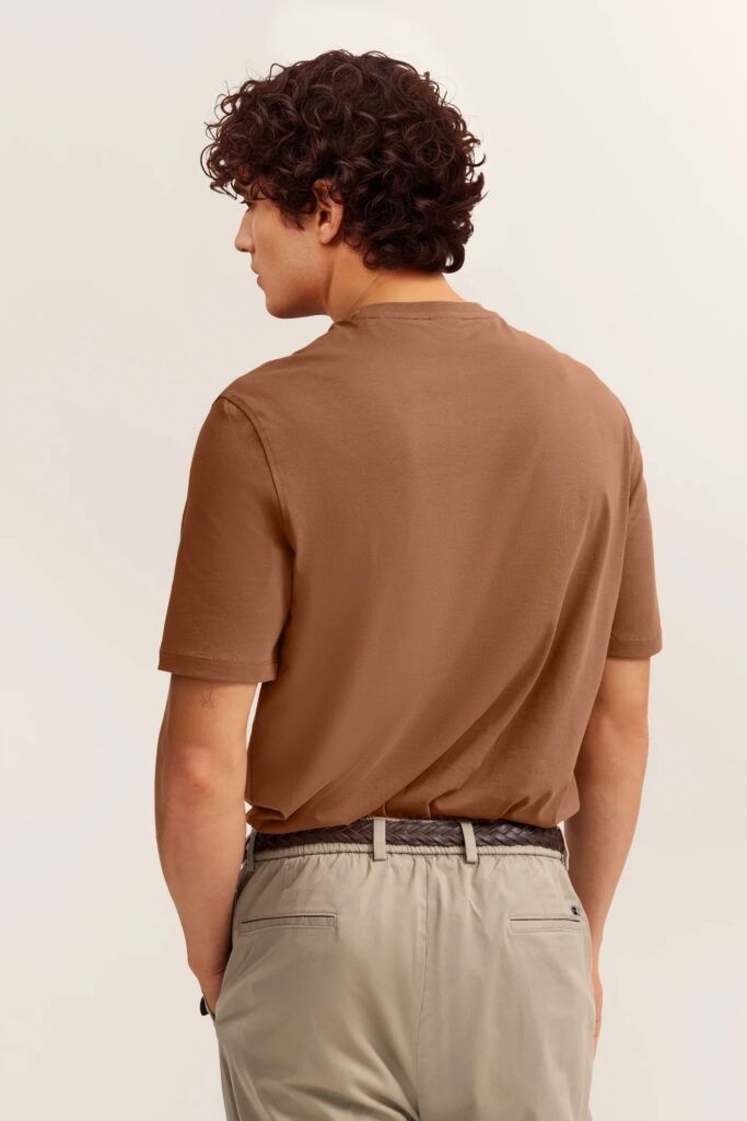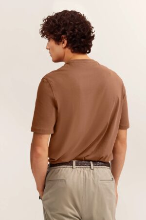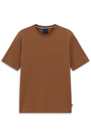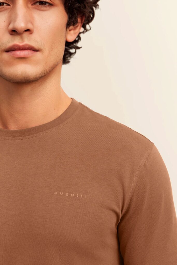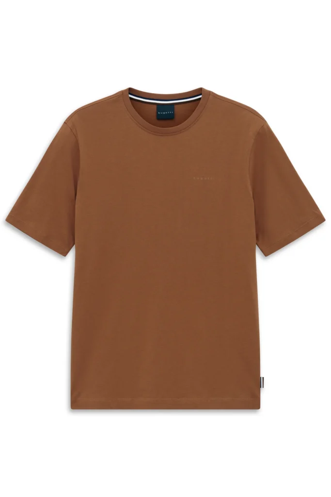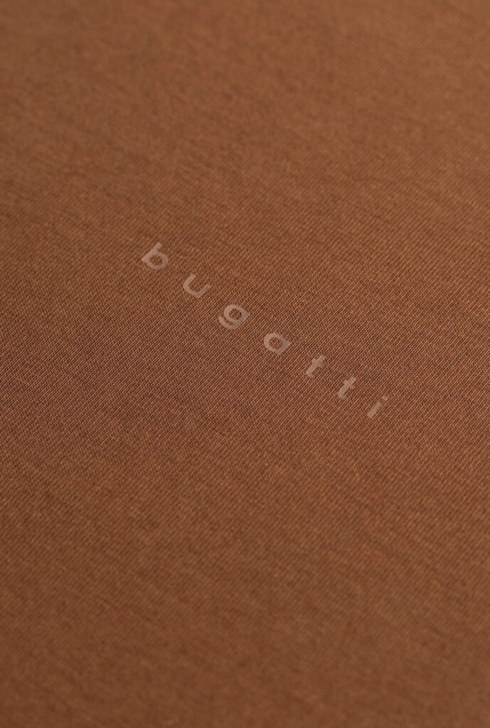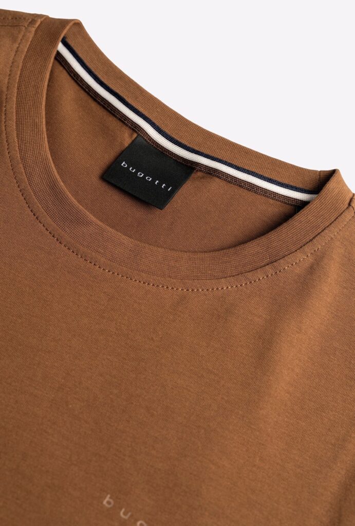 Vācu modes zīmola Bugatti vīriešu T-krekls brūnā krāsā. Izgatavots no 100% kokvilnas. Papildināts ar smalku logo vientoņa uzrakstu un zīmola krāsu emblēmu sānā.