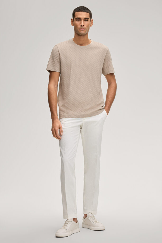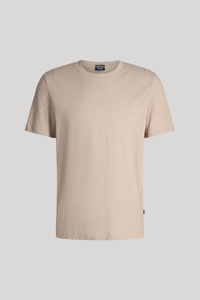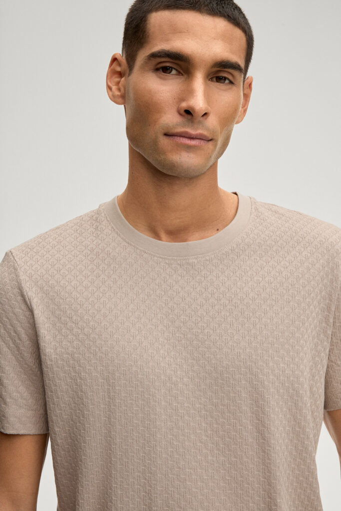 Vācu modes zīmola Joop! vīriešu T-krekls pelēcīgi bēšā krāsā. Izgatavots no 100% kokvilnas ar dekoratīvu žakarda tekstūru. Papildināts ar kontrastējošu zīmola emblēmu sānu vīlē.