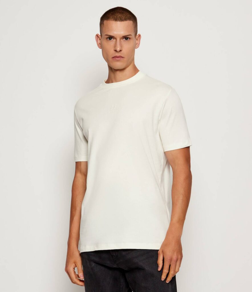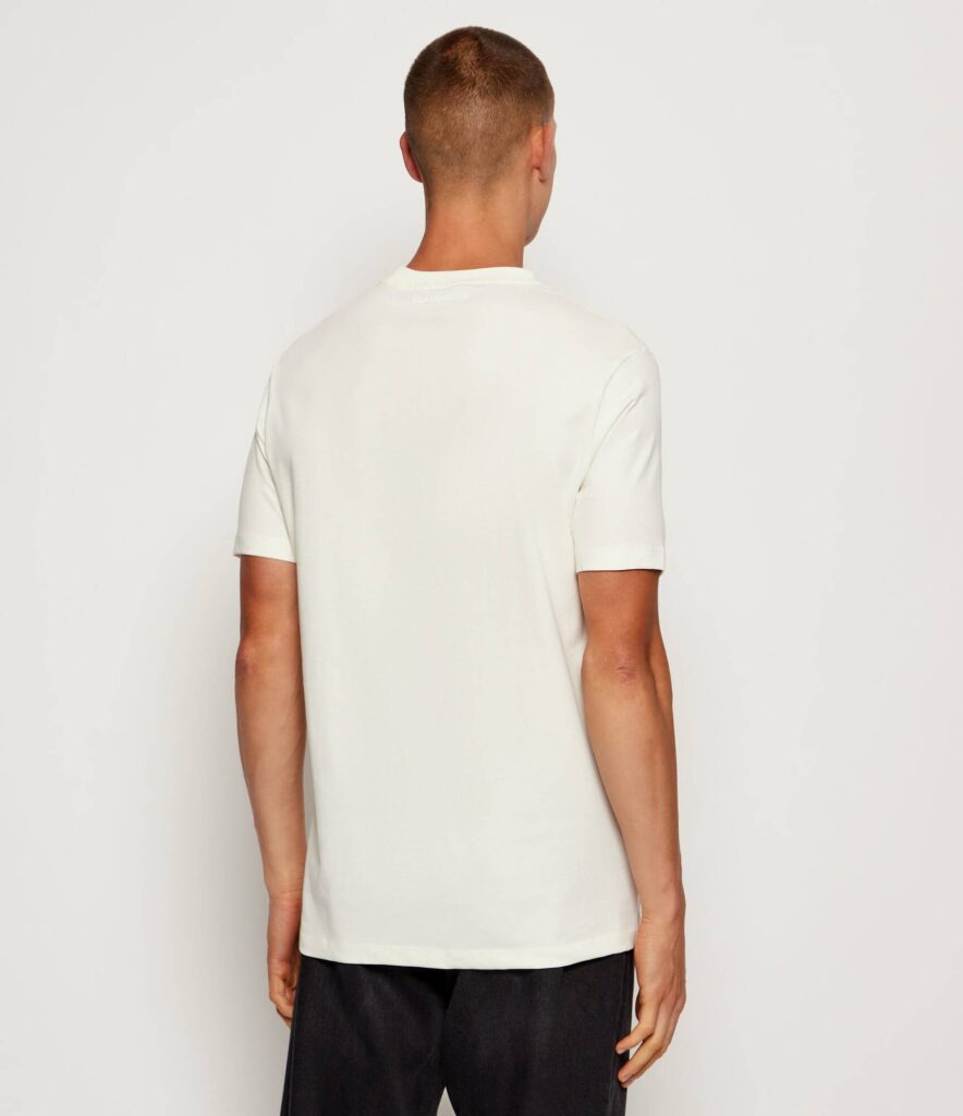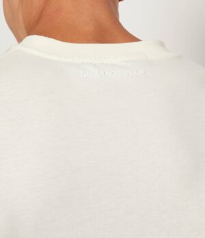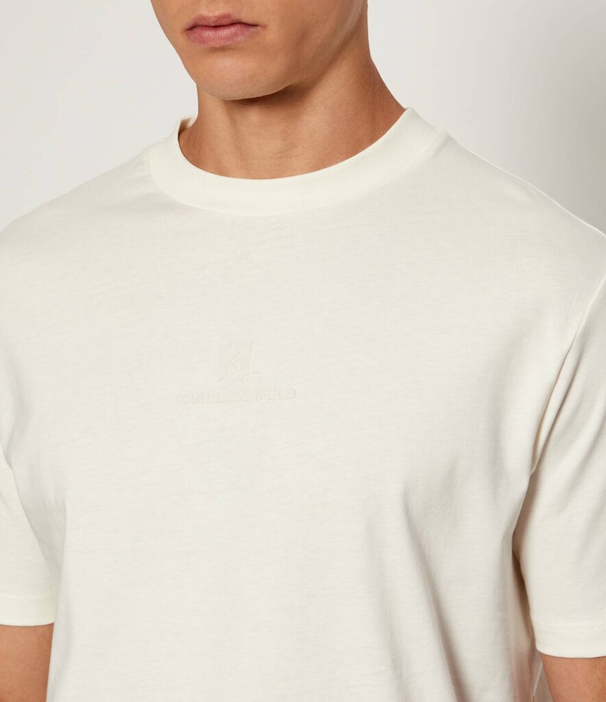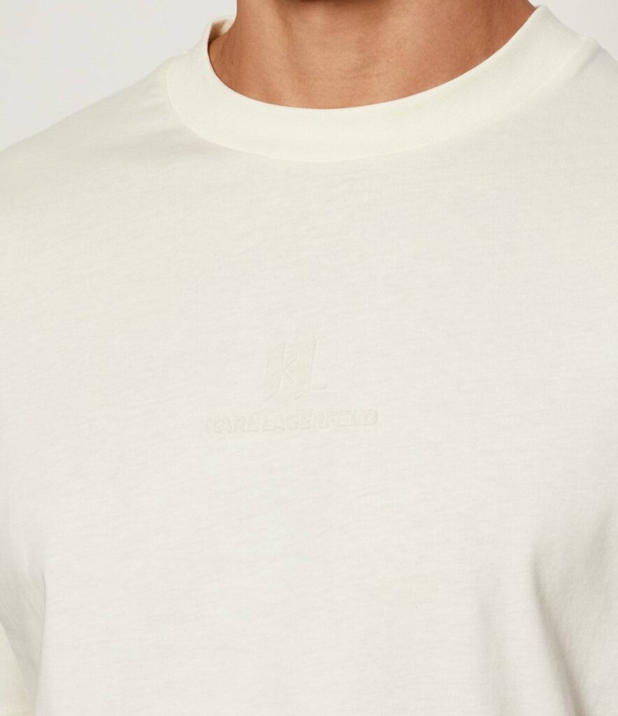 Vācu luksusa zīmola Karl Lagerfeld krēmbalts vīriešu kokvilnas T-krekls ar zīmola logtipa un monogrammas reljefu.