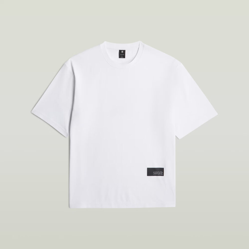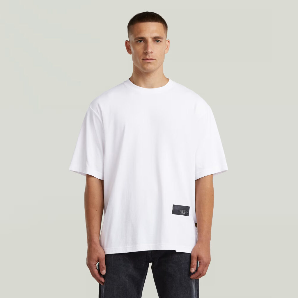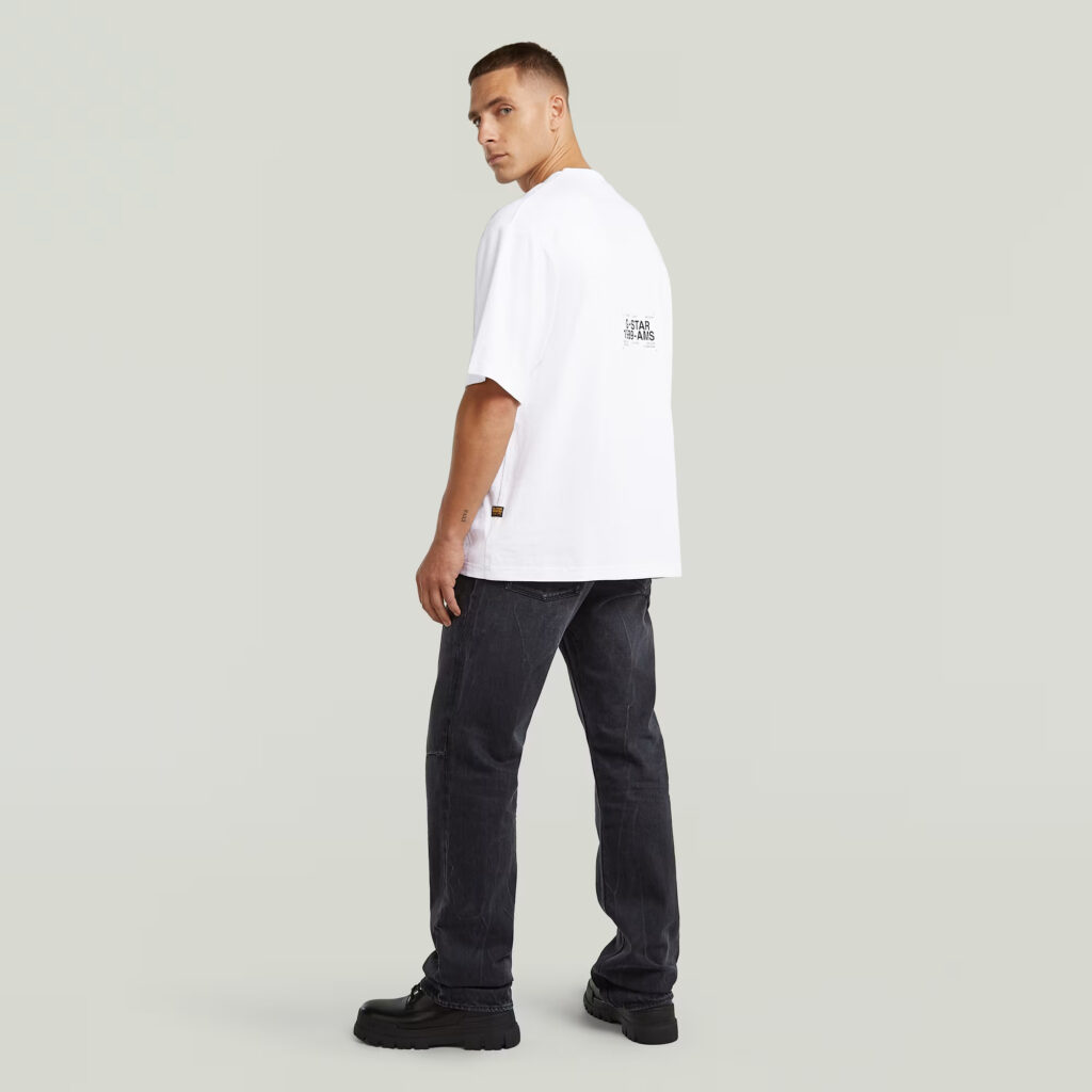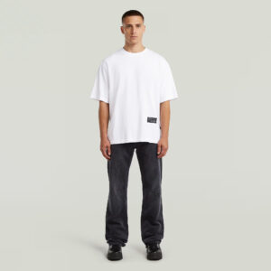 Nīderlandes zīmola G-Star Raw balts plata piegriezuma vīriešu T-krekls ar kontrastējošu zīmola uzrakstu mugurpusē. Izgatavots no blīva organiskās kokvilnas materiāla. Papildināts ar grafisku zīmola akcentu un logo emblēmu apakšmalā.