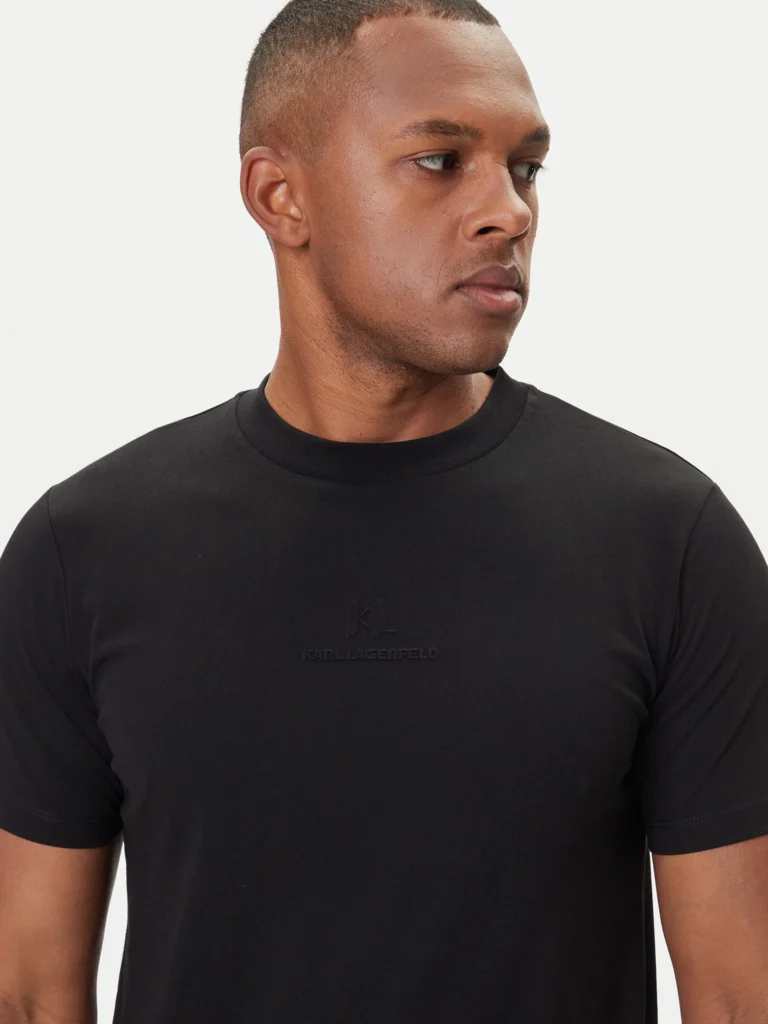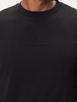 Vācu luksusa zīmola Karl Lagerfeld melns vīriešu kokvilnas T-krekls ar zīmola logtipa un monogrammas reljefu.