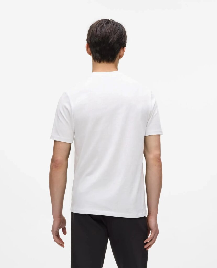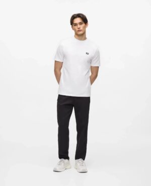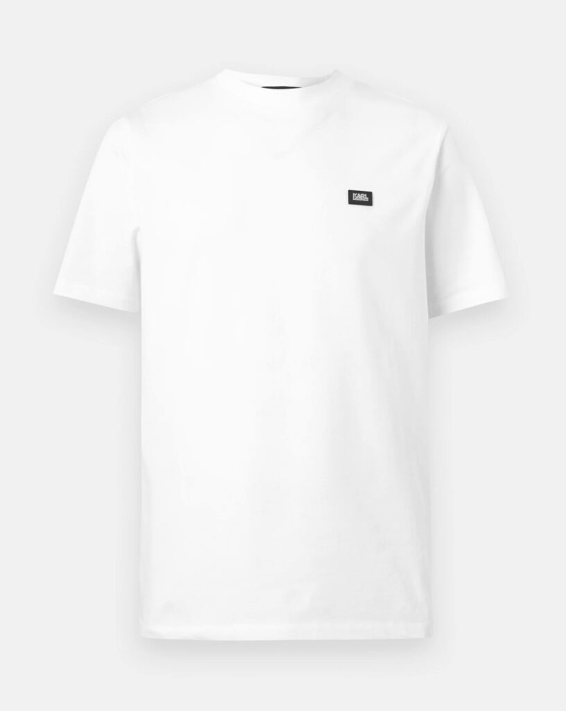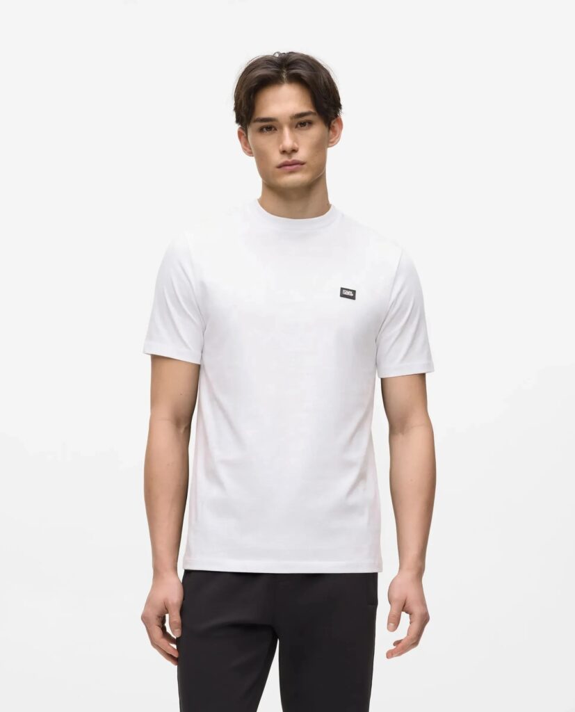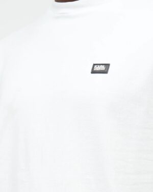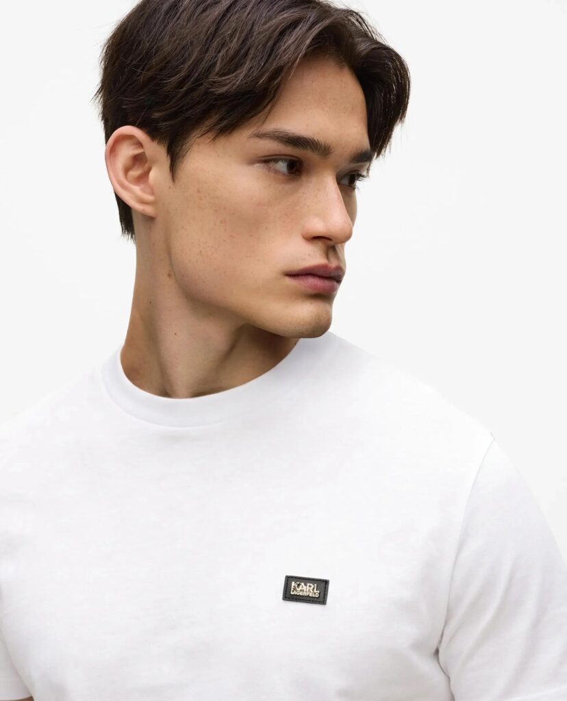 Vācu luksusa zīmola Karl Lagerfeld vīriešu T-krekls baltā krāsā. Izgatavots no elastīgas kokvilnas. Akcentēts ar sudraba krāsas zīmola logotipu uz melnas ādas emblēmas.