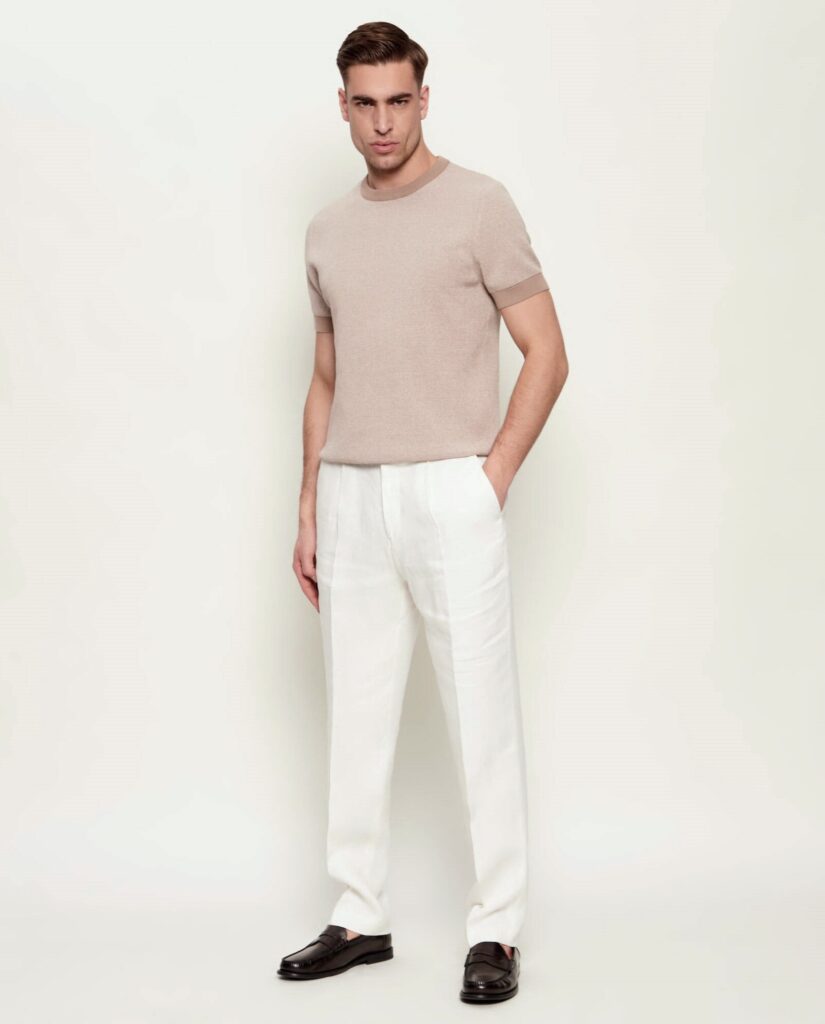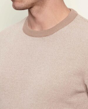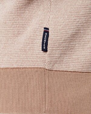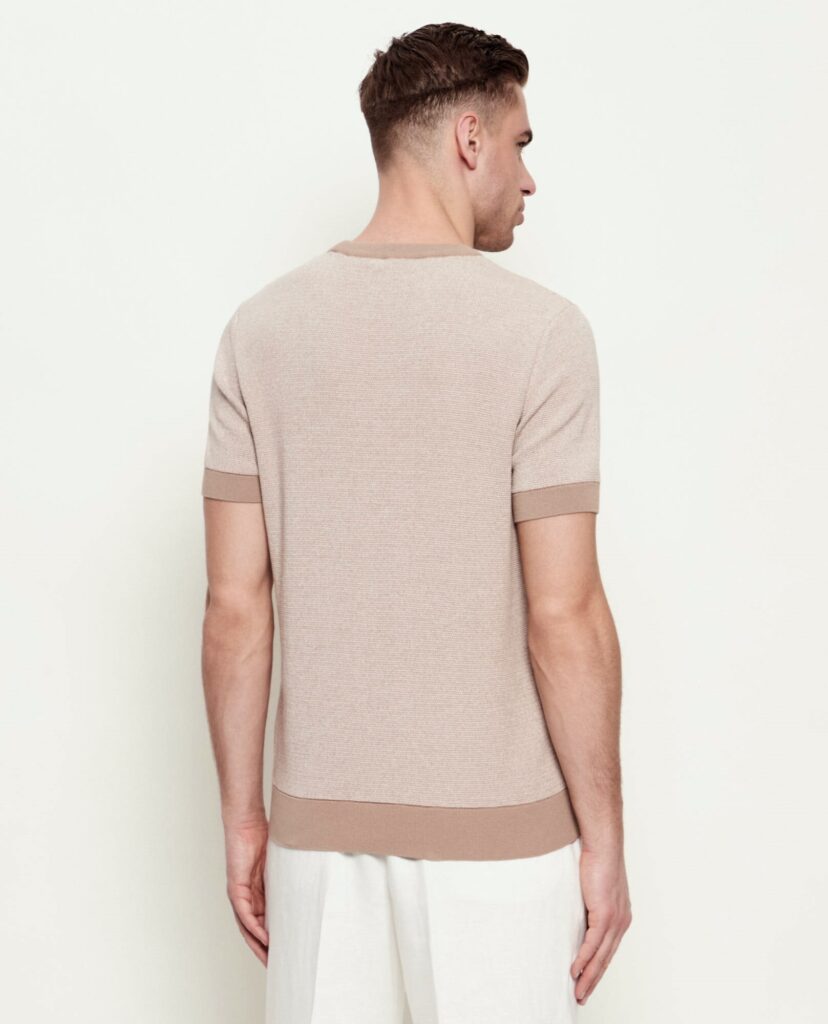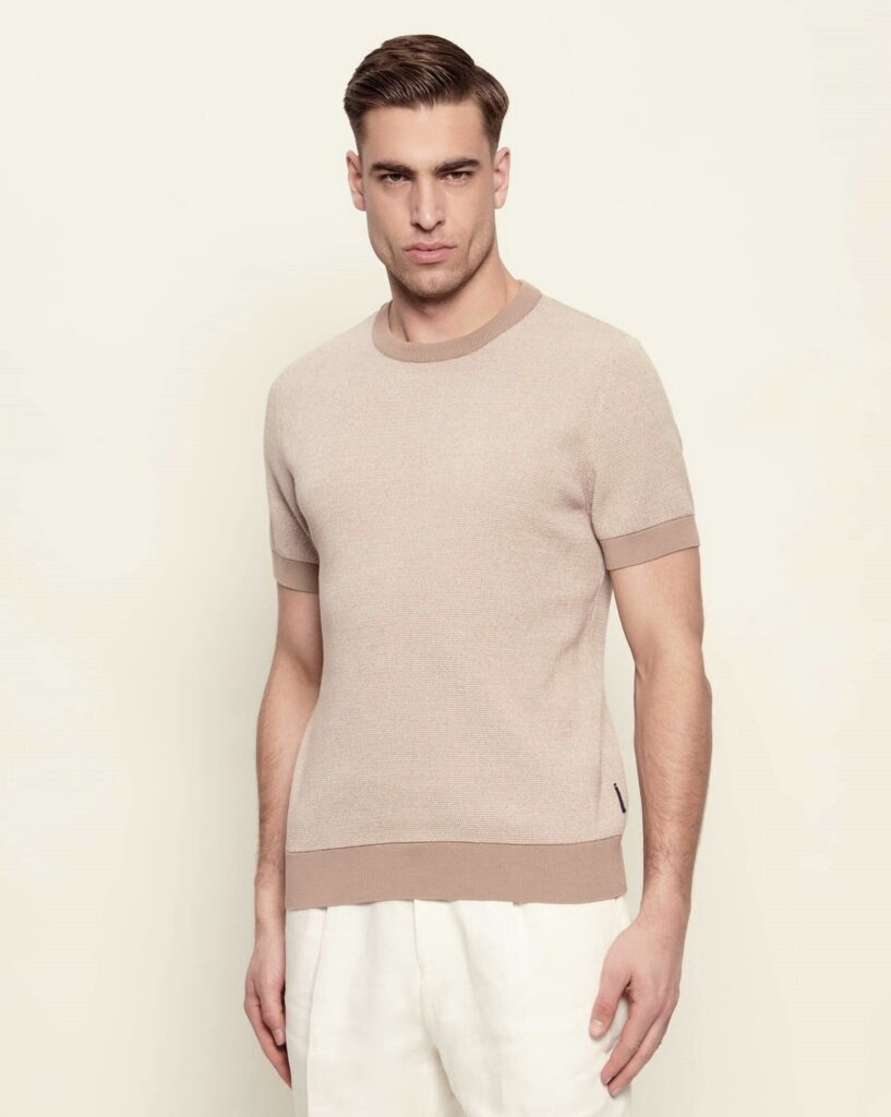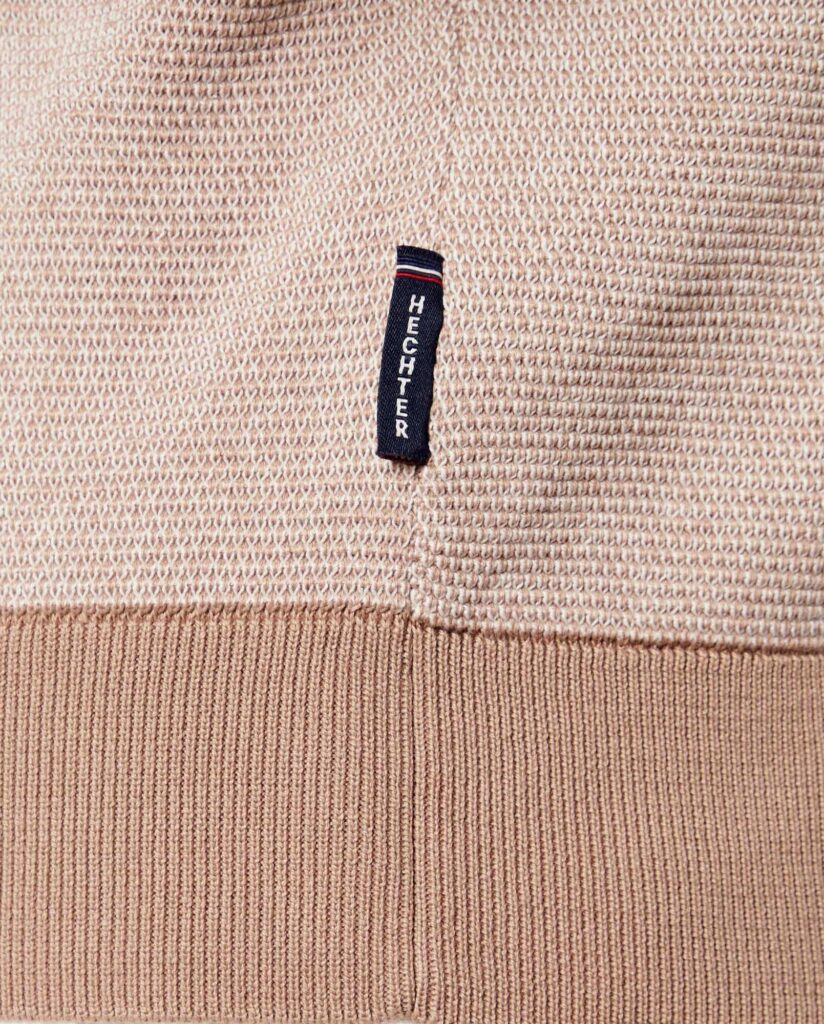Franču zīmola HECHTER PARIS bēšs vīriešu T-krekls ar smalki raibu divu toņu tekstūru un tumšāku vientoņa apdari. Izgatavots no 100% kokvilnas ar raupju tekstūru. Papildināts ar smalki rievotu apdari un emblēmas akcentu sānu vīlē.
