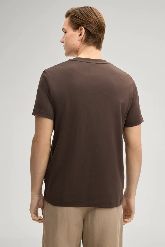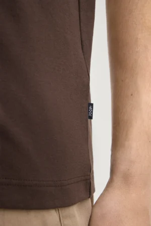 Vācu modes zīmola Joop! vīriešu T-krekls šokolādes brūnā krāsā. Izgatavots no blīva augstākās kvalitātes bio kokvilnas materiāla. Papildināts ar askētisku zīmola ikoniskā simbola- rudzupuķes vientoņa izšuvumu un kontrastējošu logo emblēmu sānā.