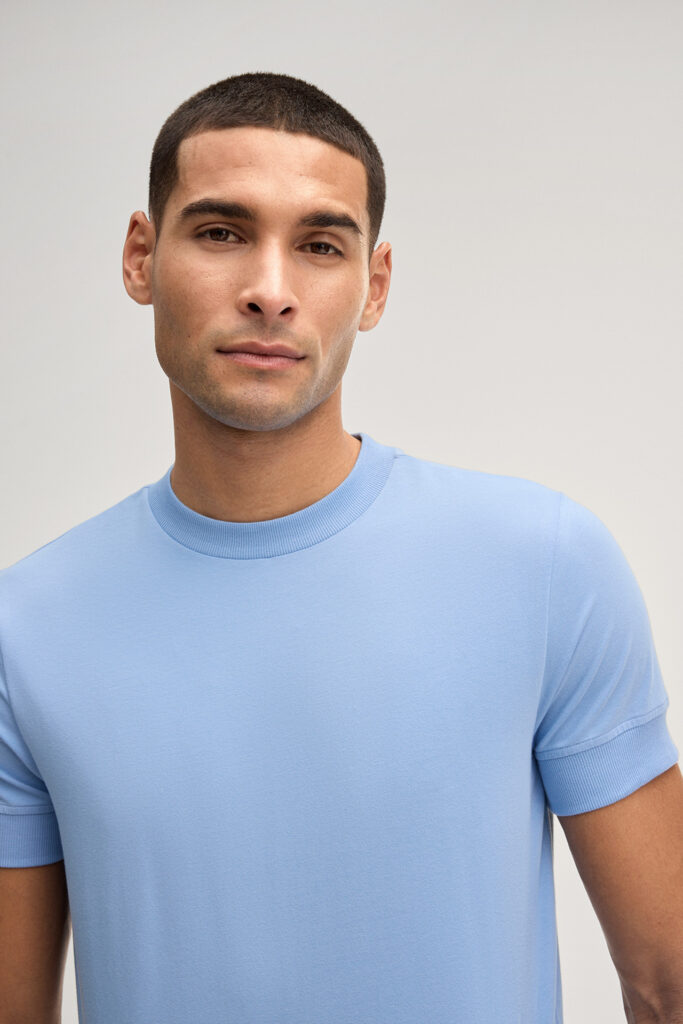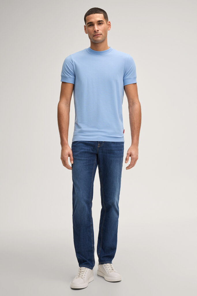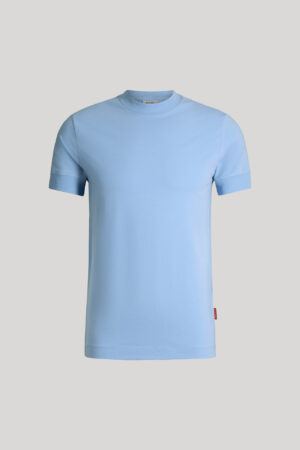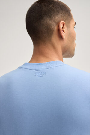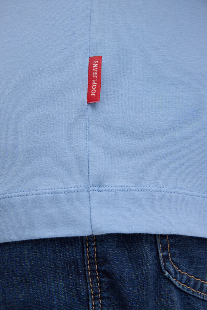 Vācu modes zīmola Joop! Jeans vīriešu T-krekls gaiši debeszilā krāsā. Izgatavots no elastīgas augstākās kvalitātes kokvilnas. Papildināts ar smalki rievotu apdari, kā arī vientoņa logotipu pie apkakles mugurpusē un kontrastējošu zīmola emblēmas akcentu apakšmalā.