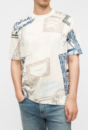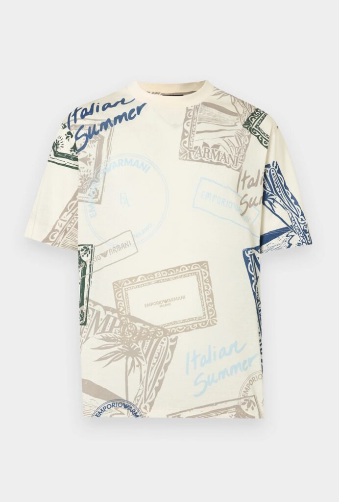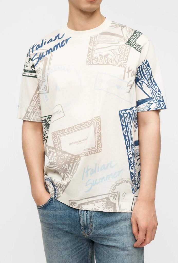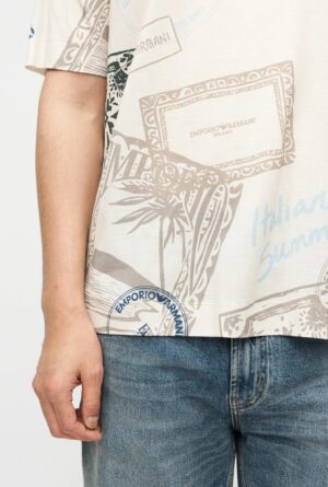 Itāļu luksusa zīmola Emporio Armani gaiši bēšs vīriešu T-krekls ar zīmola logotipu dizaina apdruku no viegla liocela un kokvilnas materiāla.
