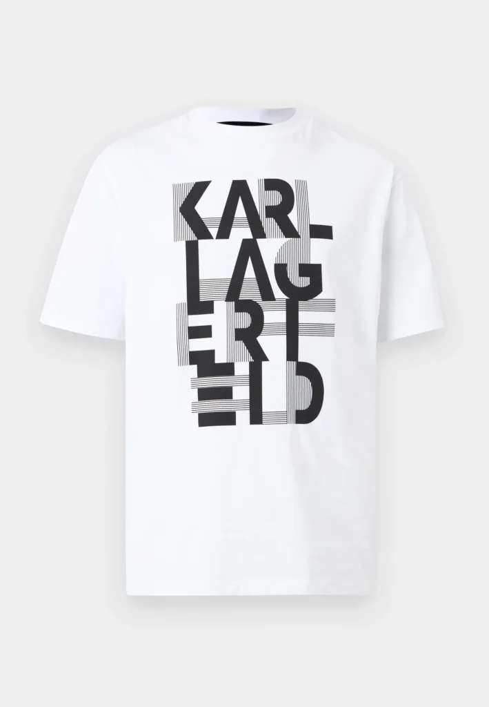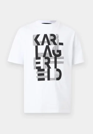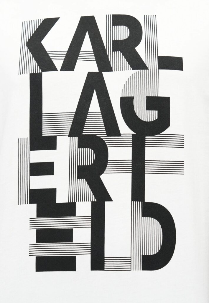 Vācu luksusa zīmola Karl Lagerfeld balts kokvilnas T-krekls ar grafisku zīmola logotipa dizaina attēlu priekšpusē.