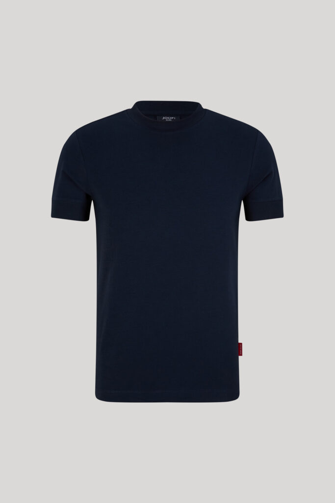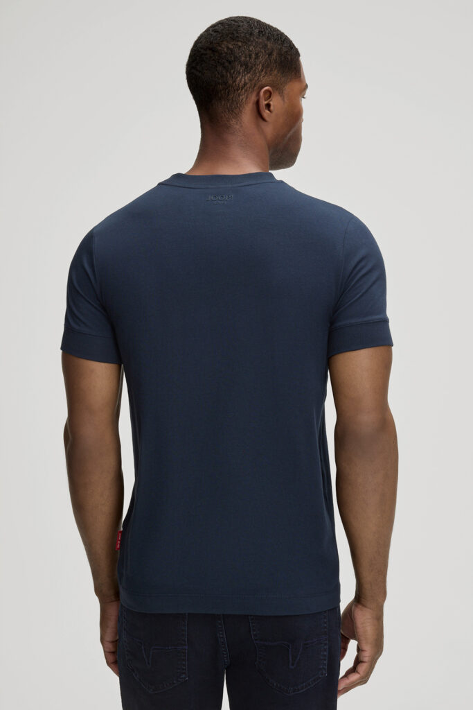 Vācu modes zīmola Joop! Jeans vīriešu T-krekls tumši zilā krāsā. Izgatavots no elastīgas augstākās kvalitātes kokvilnas. Papildināts ar smalki rievotu apdari, kā arī vientoņa logotipu pie apkakles mugurpusē un kontrastējošu zīmola emblēmas akcentu apakšmalā.